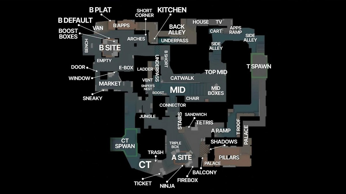 Четыре основных входа A-плента (Palace — Ковры, Ramp — Рампа (пит), Connector — Коннектор и Jungle — Джангл) делают доступ к А простым для обеих команд. Открытые пространства и удобные укрытия, такие как Jungle и Ticket Box (Тикет бокс), делают его идеальным для быстрых атак в пистолетных раундах. На скриншотах ниже указаны позиции на точке А.