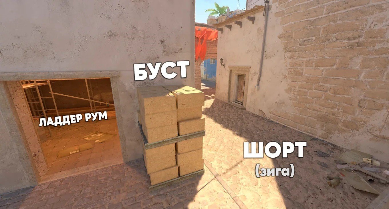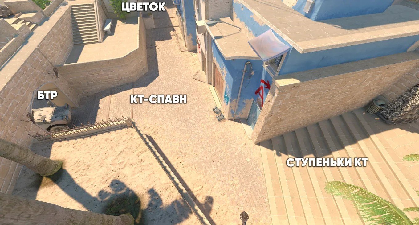 У Mirage три основных направления атаки: плент А, плент B и мид. При этом мид имеет особое значение — именно через него проходят пути к обеим точкам установки бомбы, а также он дает возможность держать под контролем большую часть карты.