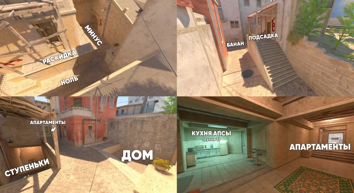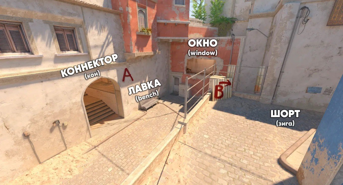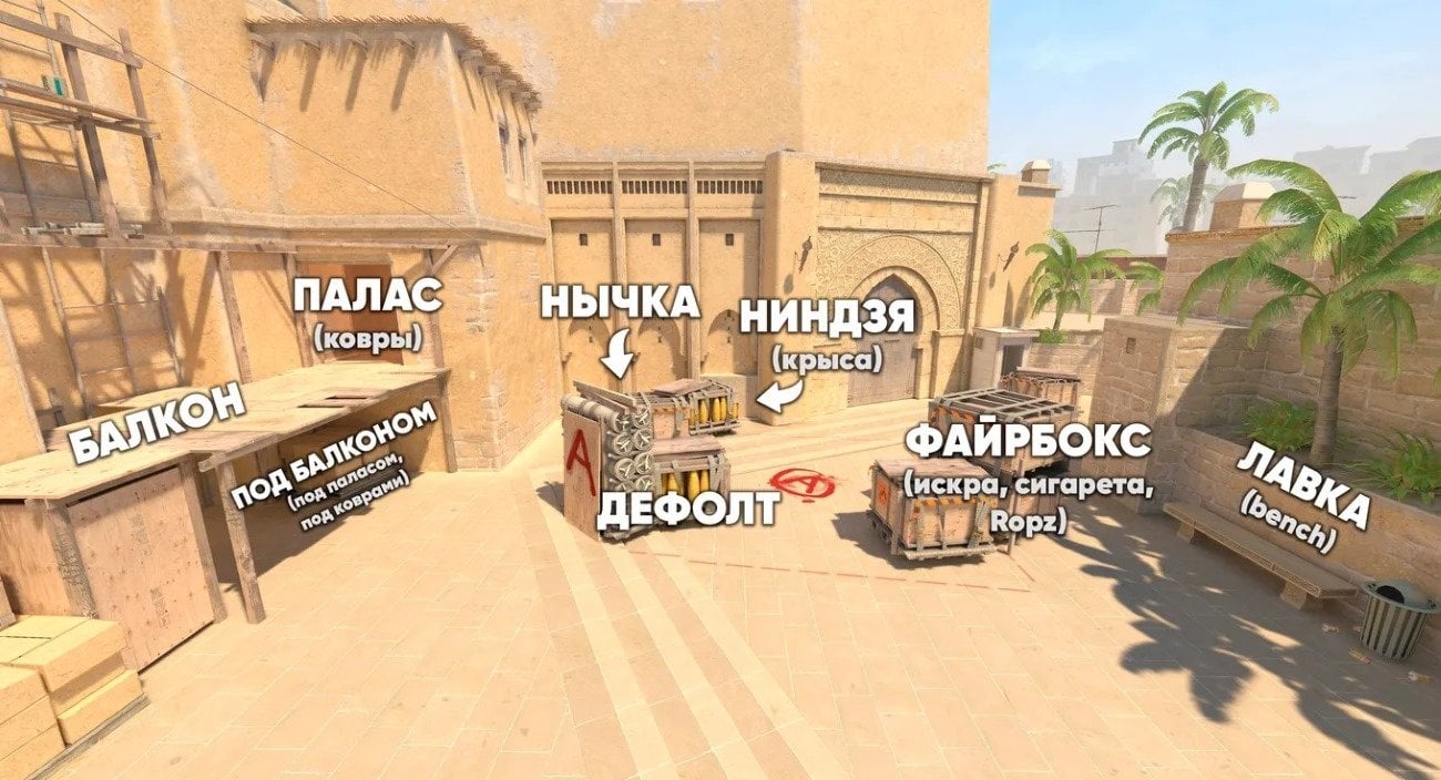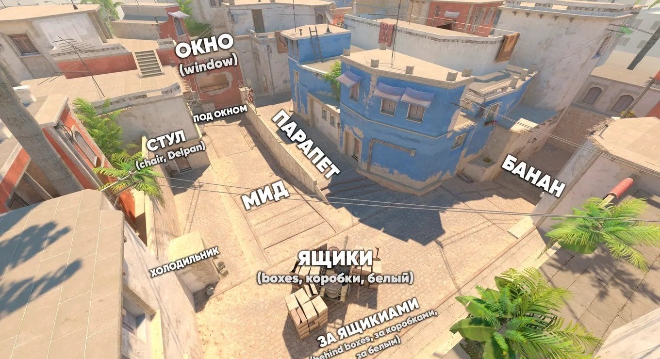 Для большей наглядности рекомендуем изучить полную карту со всеми названиями точек. Ниже вы найдете схематичное изображение Mirage с упоминанием всех ключевых позиций. Карты приведены на русском и английском языках.