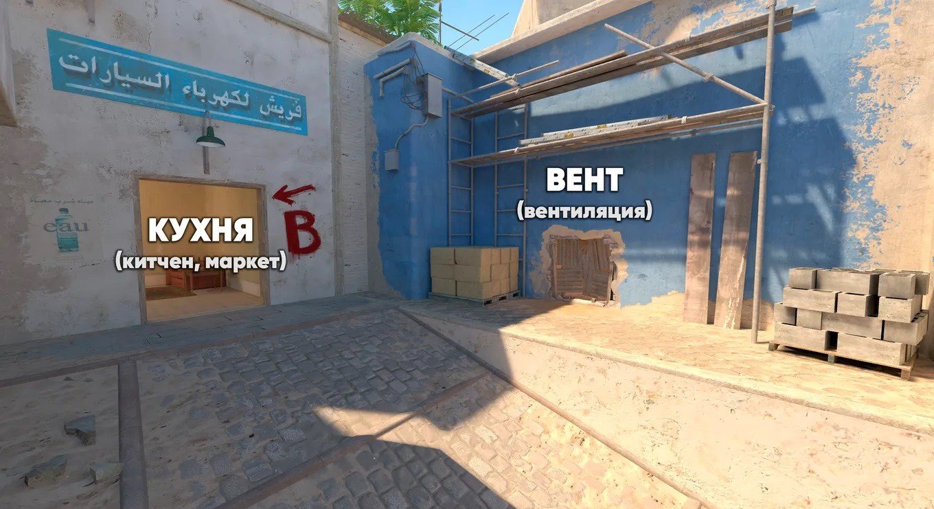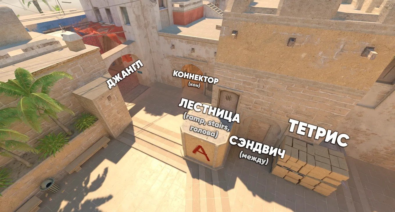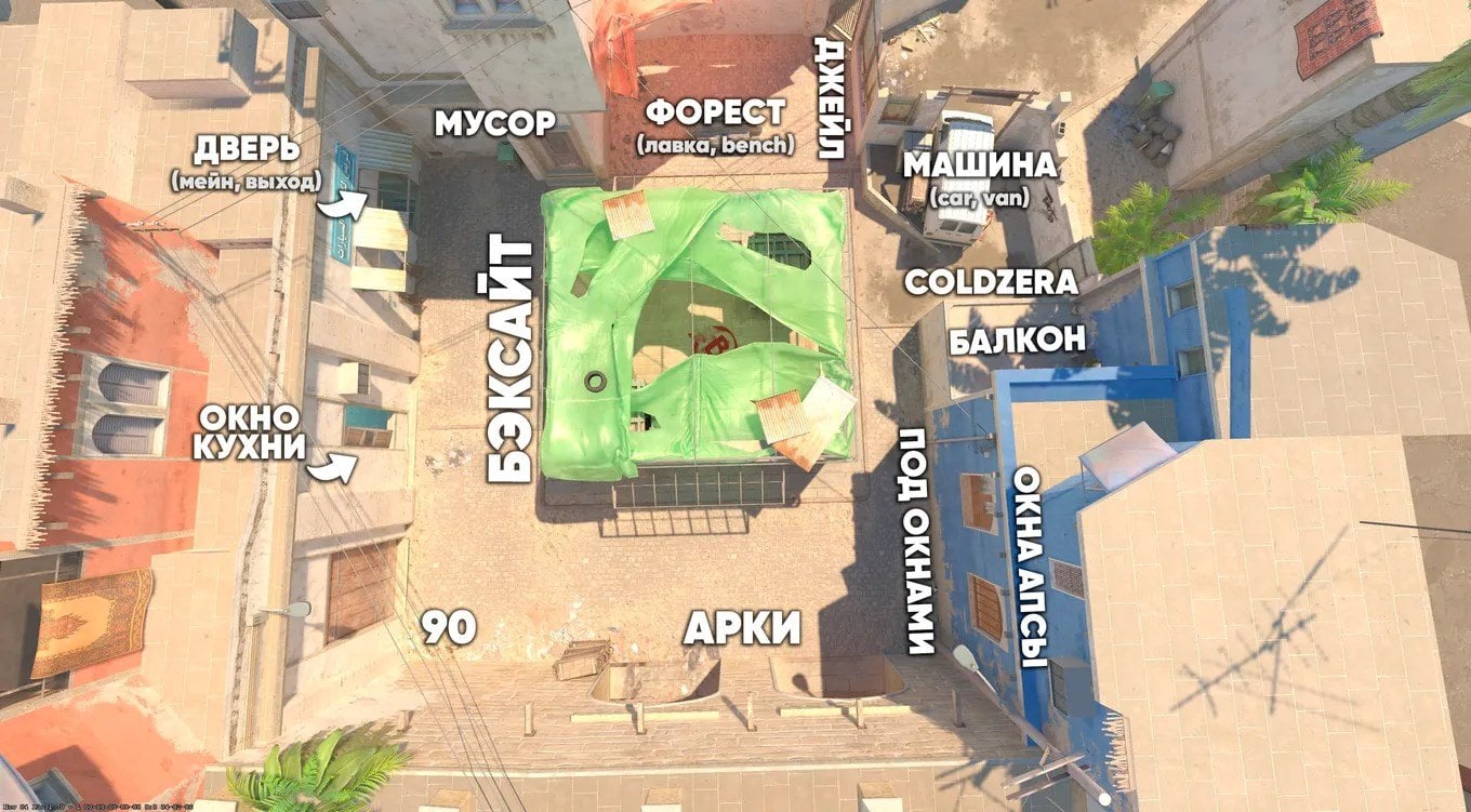 Для большей наглядности рекомендуем изучить полную карту со всеми названиями точек. Ниже вы найдете схематичное изображение Mirage с упоминанием всех ключевых позиций. Карты приведены на русском и английском языках.