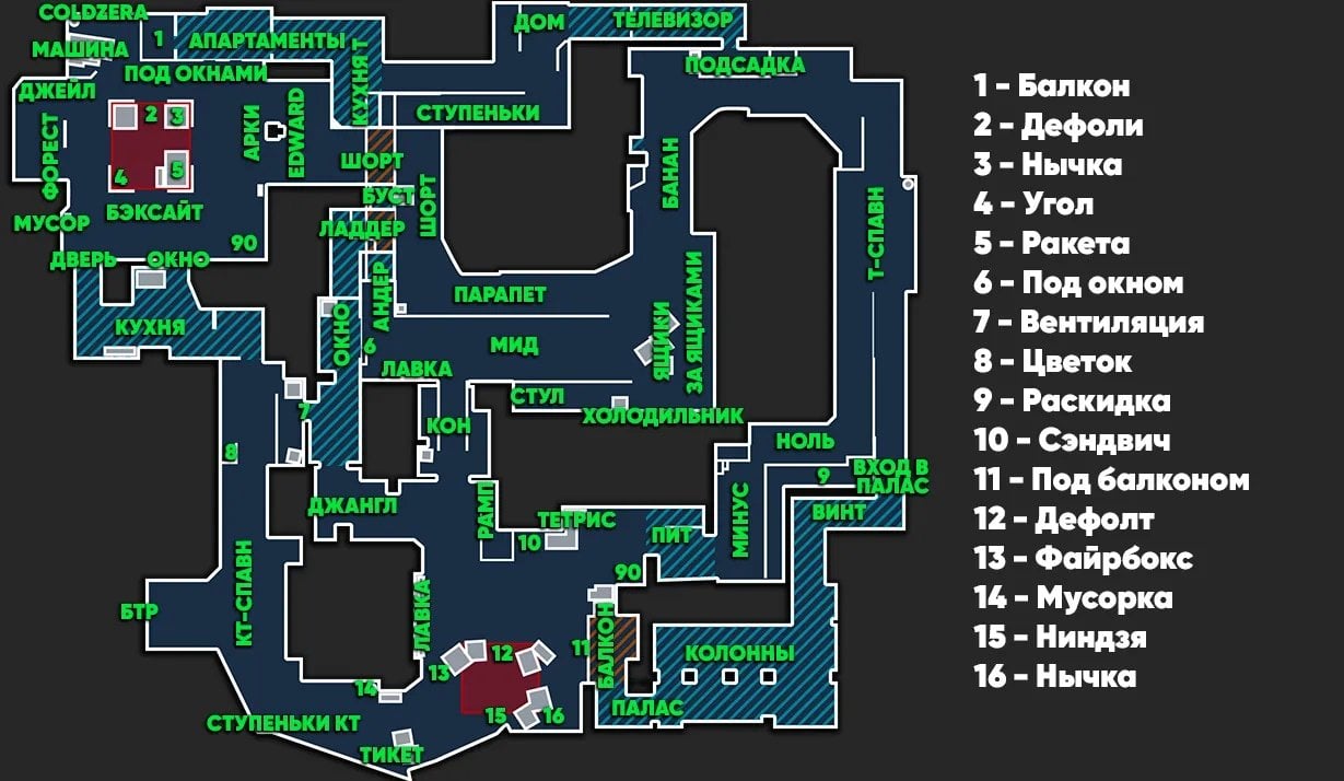 Полная карта всех позиций на Mirage на русском и английском языках