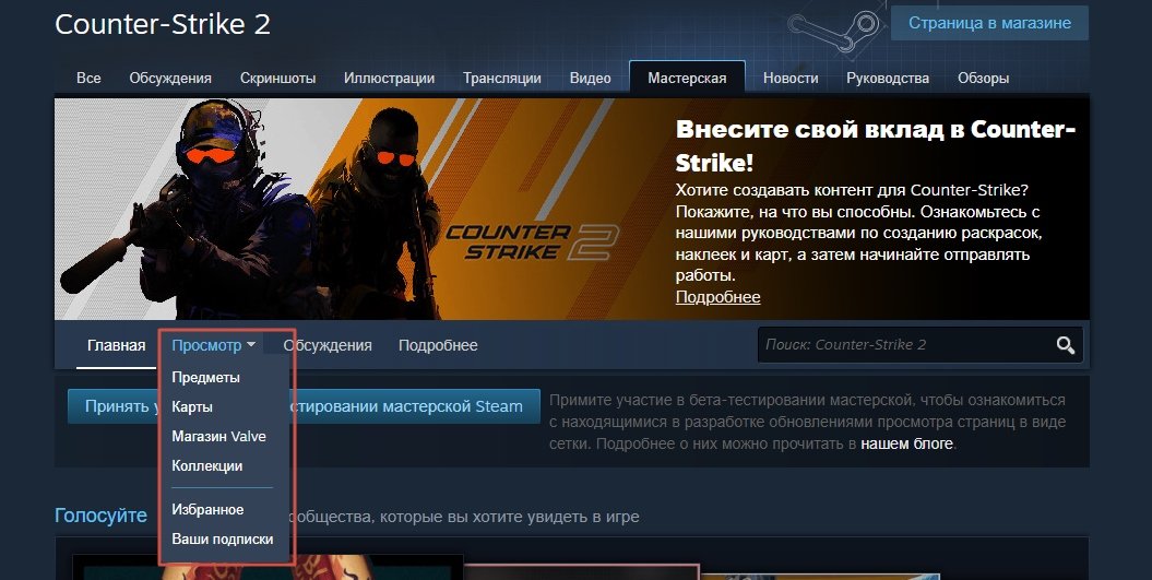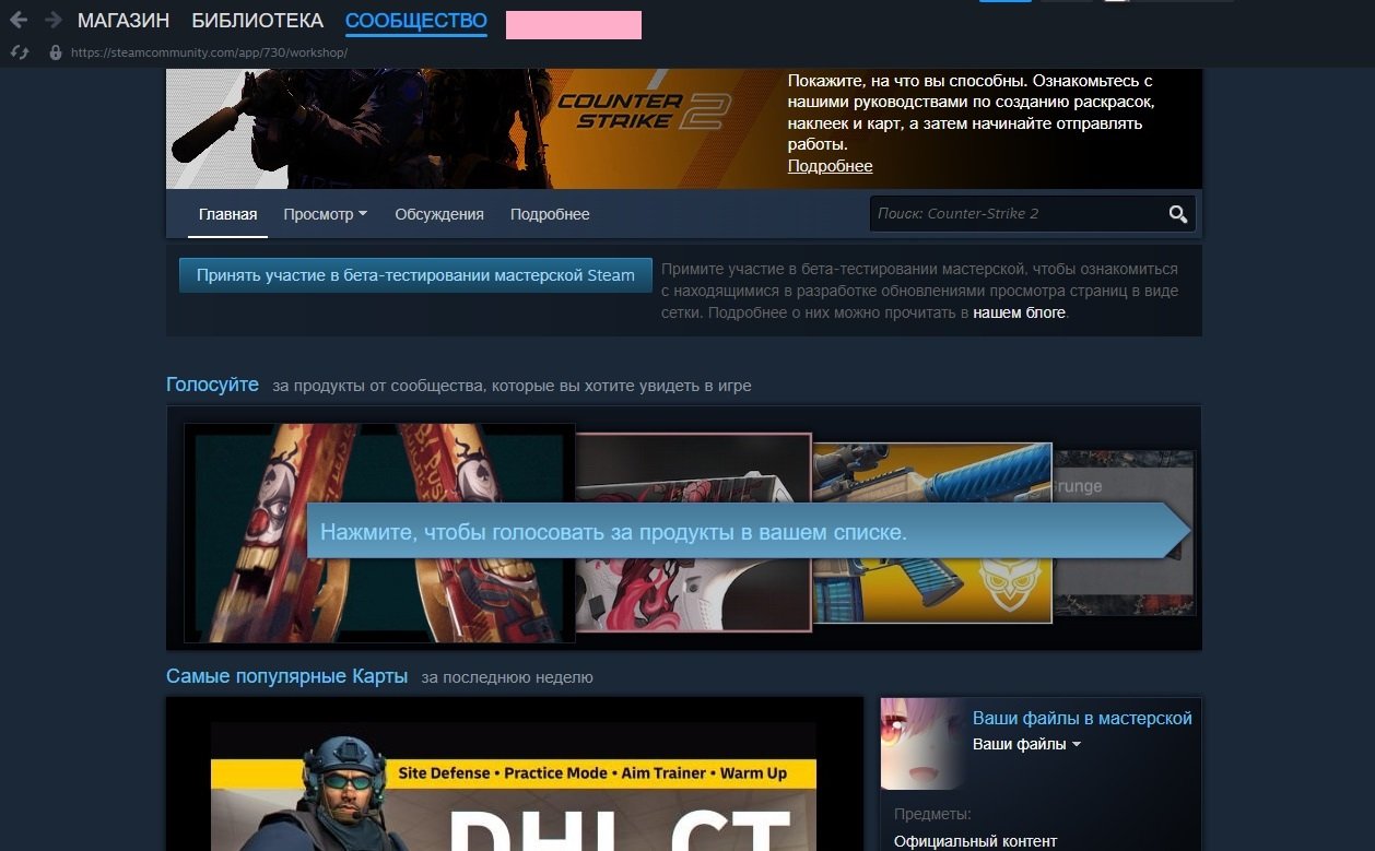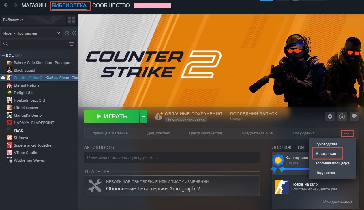 Далее в библиотеке Steam найдите Counter-Strike 2. На странице игры вы увидите вкладку «Мастерская» — нажмите на нее. В Мастерской вы увидите различные категории контента. Чаще всего игроки ищут карты.