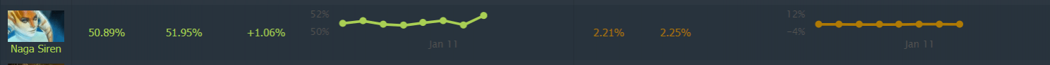 С нового года винрейт наги колебался в районе 50-51%. Герой, конечно, достаточно ситуативный, однако он был и остается хорошей контрой нашему имбовому (в прошлом) Ликану. Возможность отпушивать лайны, отбиваясь от той же Бруды, Чена и Бистмастера - хороший аргумент, чтобы пикнуть этого героя.