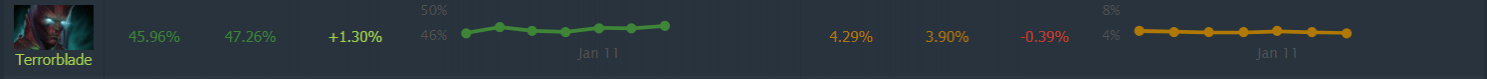 Герой, который уже давным давно стал метовым, имеет одну роковую слабость - кулдаун основной способности под названием метаморфоза. Без нее вы остаетесь достаточно слабым героем, кайтить которого можно без большого напряжения. Винрейт данного героя с начала нового года не поднимался до 50%. А все потому, что в игре есть более сильные персонажи. Но в ближайшем будущем стоит ожидать небольшого прироста побед, поскольку новый патч заметно усилил Террорблэйда.