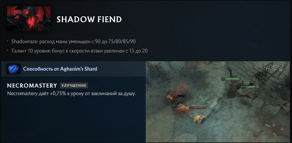 Нельзя забывать и о Aghanim's Shard. Если вы накопили 20 душ и приобрели сей артефакт, то вы получаете +15% к магическому урону. В лейт гейме герой также сильно страдал от невозможности поменять блинк на что-то более полезное. Теперь же у него есть Arcane Blink, который помогает быстрее кастовать и снижает перезарядку.