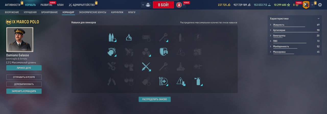 Marco Polo — один из самых удачных угольных премов: итальянский линкор IX уровня за 225 000 угля. Фугасов нет, зато есть мощные полубронебойные снаряды. Они отлично наказывают эсминцы и крейсеры и даже позволяют забирать цитадели благодаря калибру 406 мм. Основная проблема — точность.