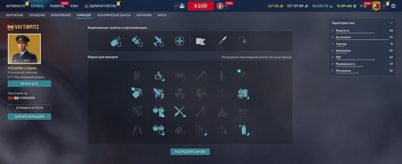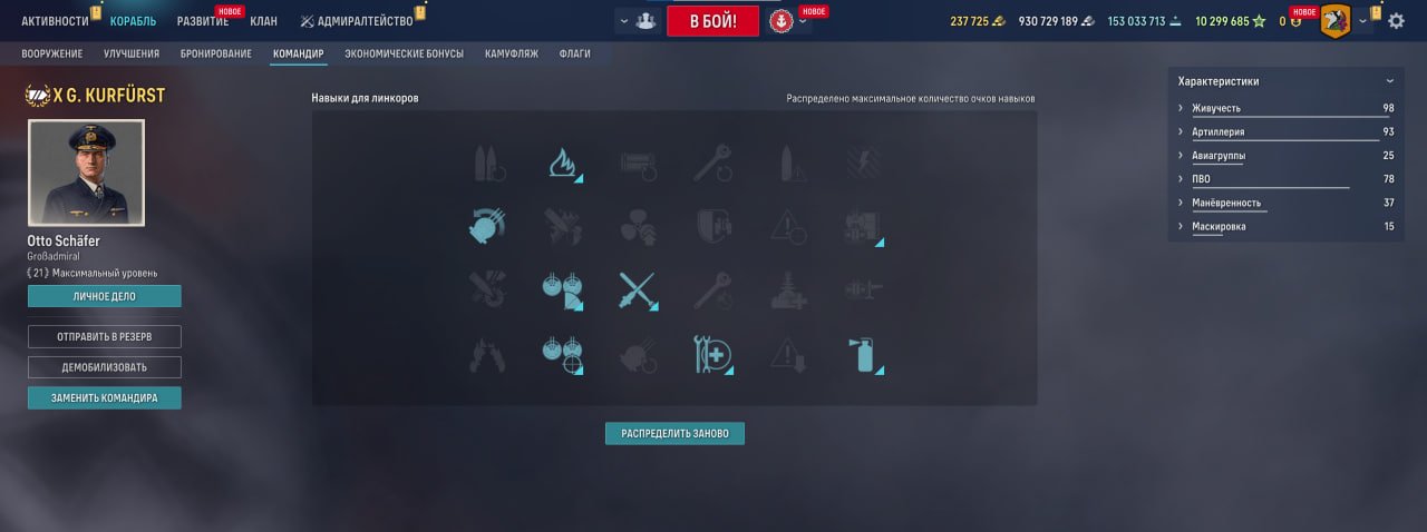 Классический немецкий линкор X уровня — жирный, живучий и с ГАПом. Главное достоинство — мощное ПМК: с прокачкой оно достает до 12,5 км и при сближении стабильно раздает урон и пожары. С Лютьенсом ПМК становится еще злее и точнее, так что уголь на этого капитана тратится не зря.
