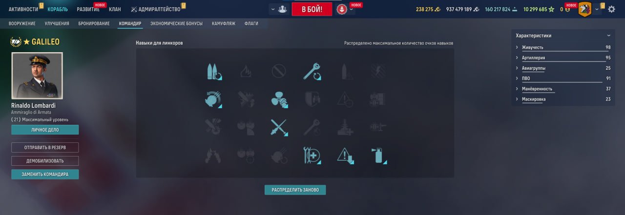 Имеет ПББ и ББ, которые точно летят прямо в цель и отнимают значительное количество хп. Также этот корабль может пустить дымы и снова разрывать противников полубронебойками, которые пробивают в любую проекцию и поджигают пятую точку игрока. При правильной постановке сам Галилео пробить будет проблематично.