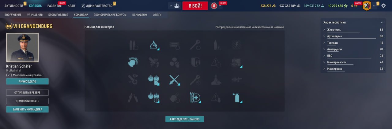 Корабль не слишком точный, особенно на дальние расстояния. Держаться от противников лучше на расстоянии ПМК, предварительно убедившись, что там их не целая куча, которая запросто утопит Бранденбург.