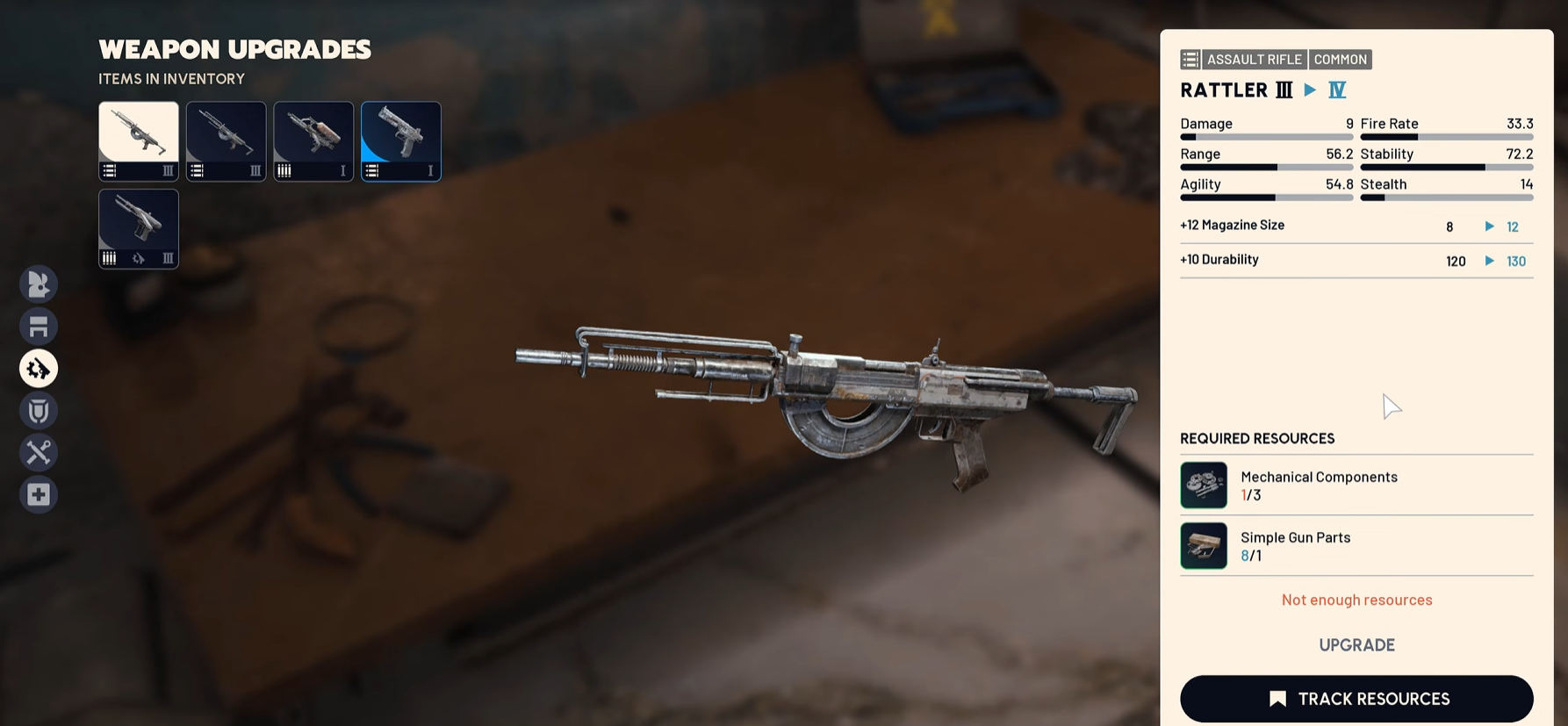 В Оружейной (Gunsmith) прокачивайте уровень вашего оружия. Например, апгрейд "Rattler" значительно увеличивает размер его магазина. Не забывайте и про модули (аттачменты), которые можно скрафтить здесь же.