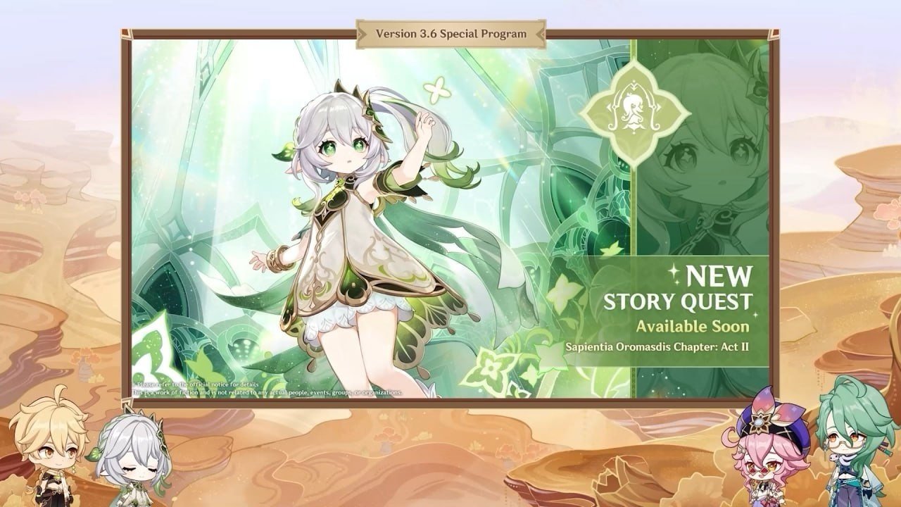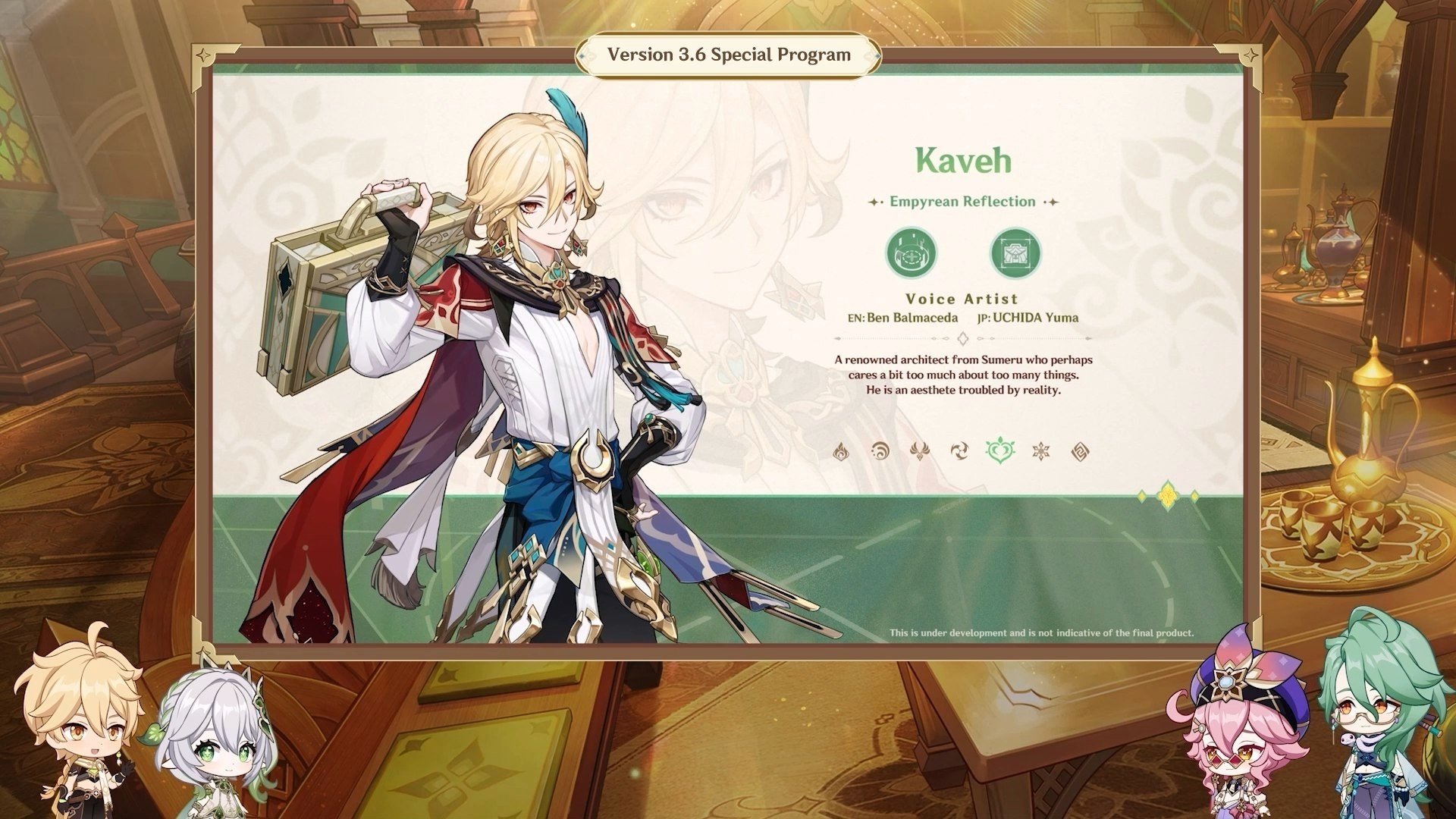 С обновлением 3.6 будут добавлены два играбельных персонажа, которые ранее встречались в ходе кампании — лекарь Бай Чжу и сумерский архитектор Кавех.