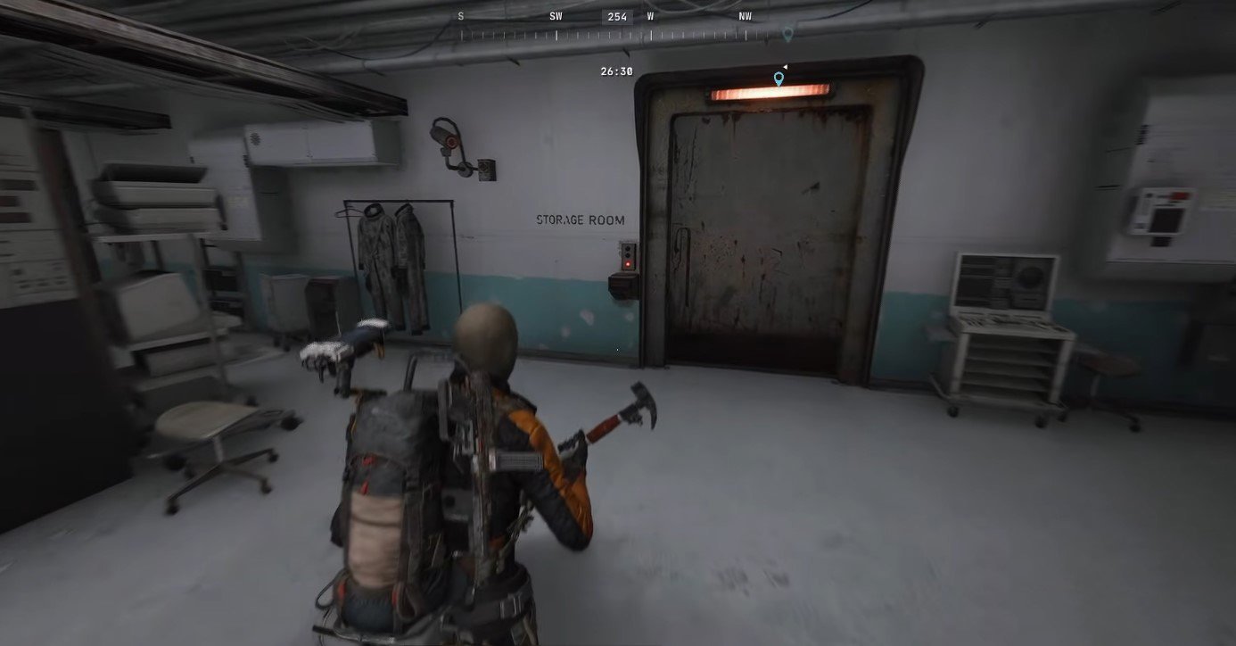 Как только пройдете через него, то окажетесь на балконе просторного помещения. Спрыгивайте вниз и сразу направо, к двери с надписью «Storage Room».