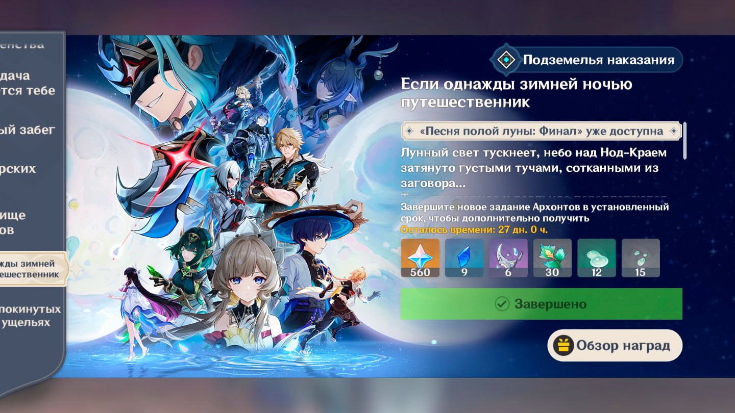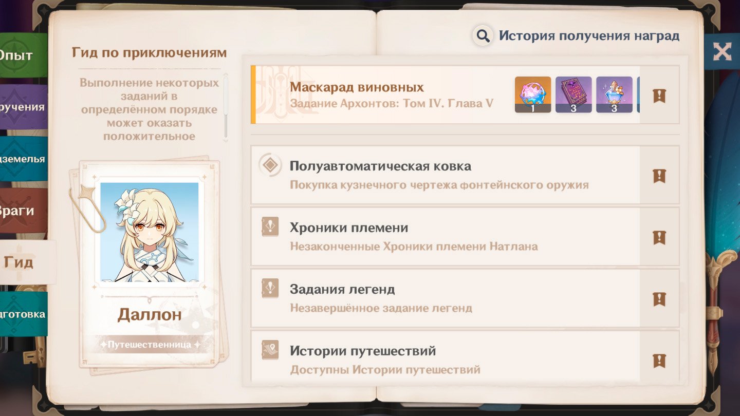 Разработчики мотивируют читать сюжет и за каждую завершенную главу заданий Архонтов в Книге приключений выдают одну ивентовую крутку. В пересчете на валюту это 160 примогемов за квест. Есть и временное событие, где требуется завершить задание Архонтов за патч, а в награду дают Камни Истока.