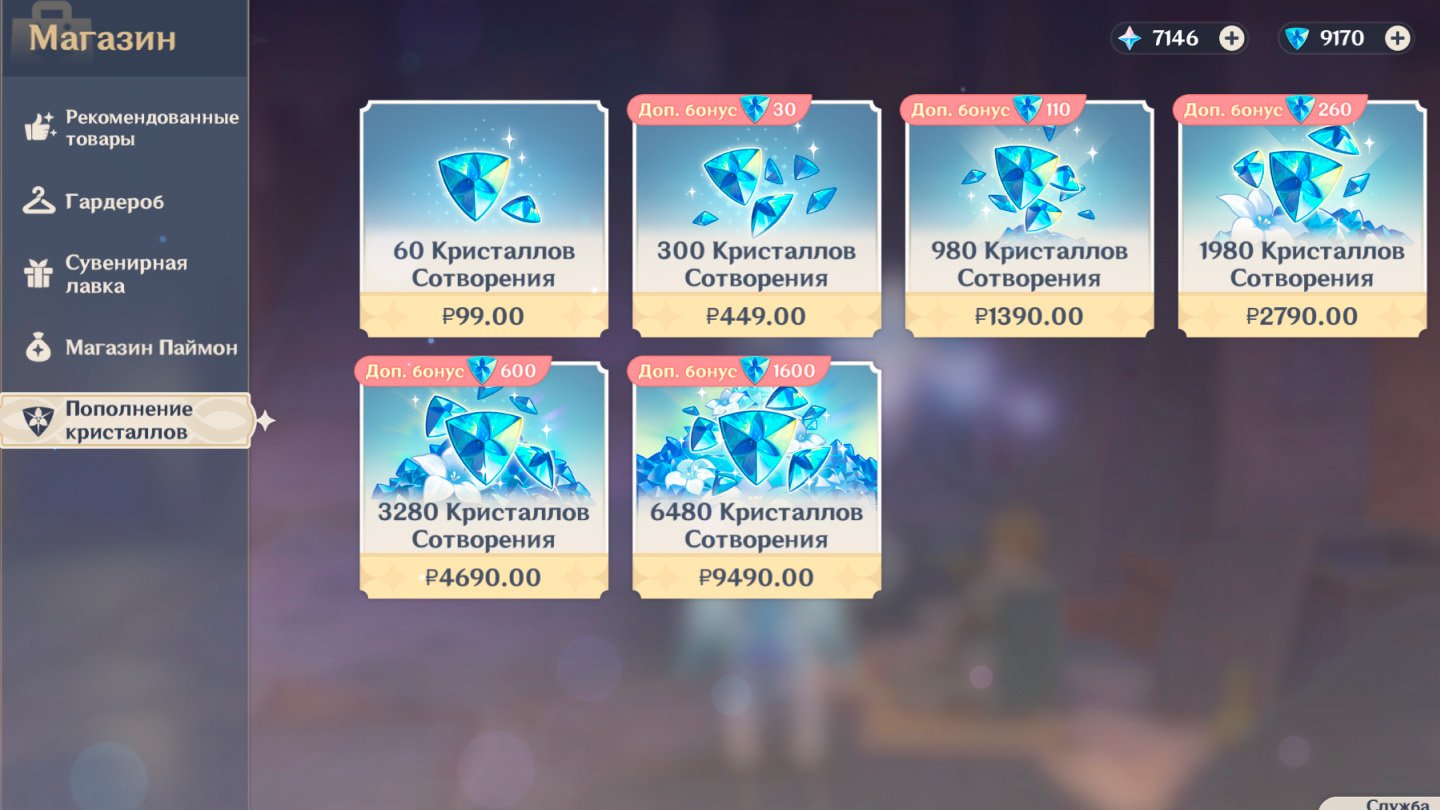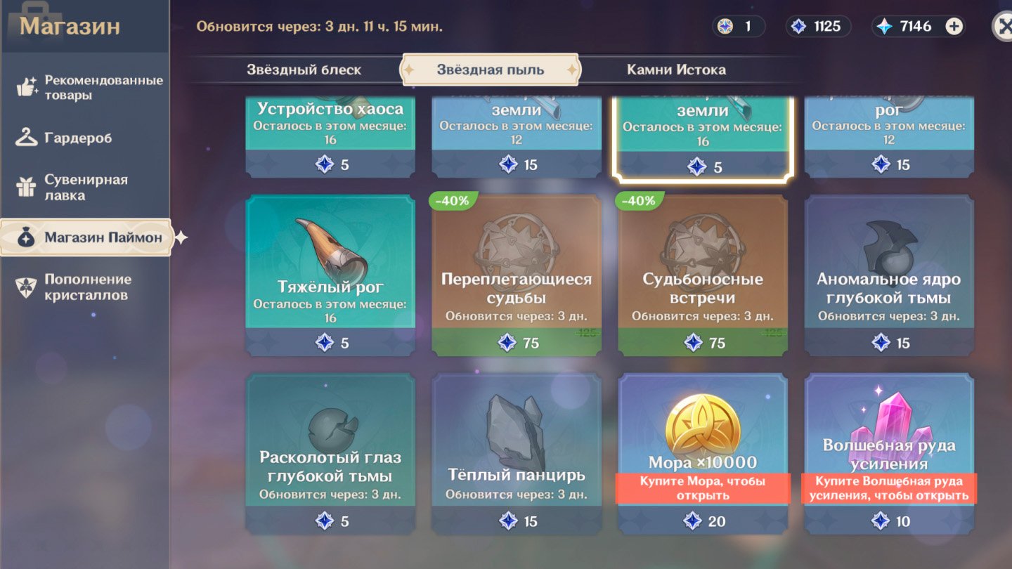 В этом меню Камни Истока продают за реальные деньги. Здесь же есть раздел для обмена кэшбэка с молитв. С каждой крутки начисляют «Звездную пыль», раз в месяц на эту валюту можно купить десять круток: пять ивентовых и пять стандартных. Лимит покупки обнуляется первого числа ежемесячно.