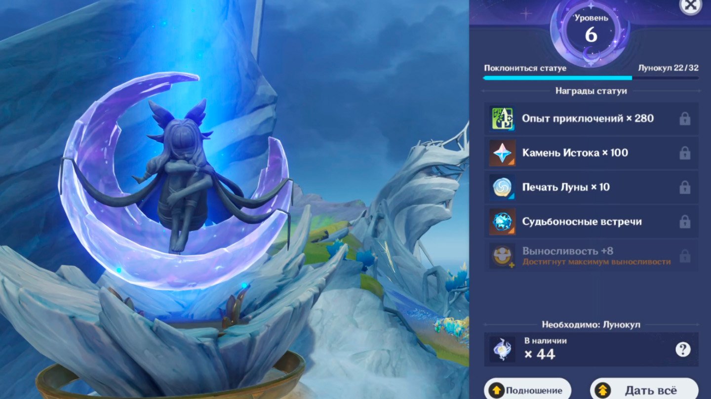 Параллельно с зачисткой карты копятся региональные печати. В каждом королевстве действует уникальная система подношений, куда эти знаки нужно сдавать. В Инадзуме это Священная сакура, в Сумеру — Древо снов, а в Фонтейне — Фонтан Люсин. Прокачка уровней таких «алтарей» дает солидный запас круток и камней.