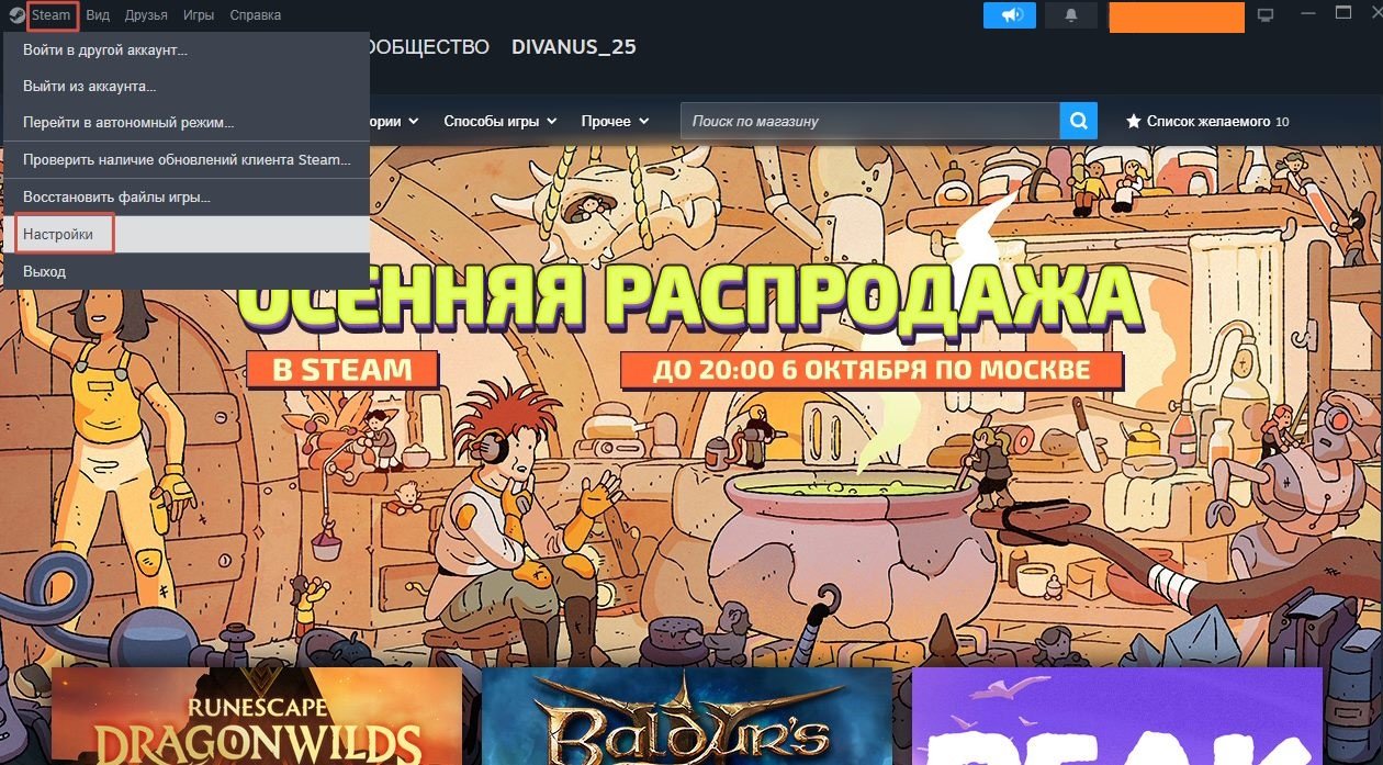 Иногда поврежденные файлы в кэше загрузки могут мешать процессу обновления. Чтобы очистить кэш запустите клиент Steam, откроете меню и выберите «Настройки». В открывшемся окне перейдите в раздел «Загрузки».