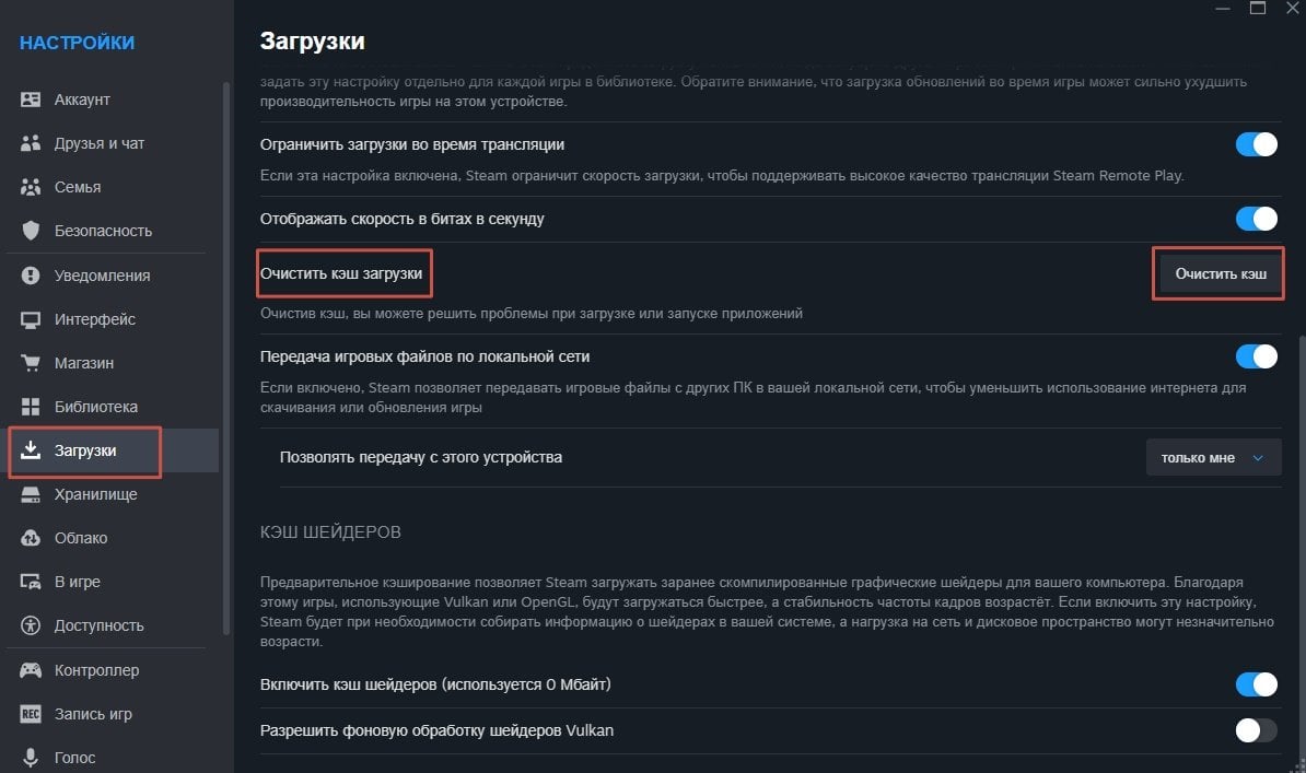 Найдите кнопку «Очистить кэш загрузки» и нажмите на нее. Steam попросит вас перезапустить клиент. После перезапуска Стим попробуйте снова проверить наличие обновлений.