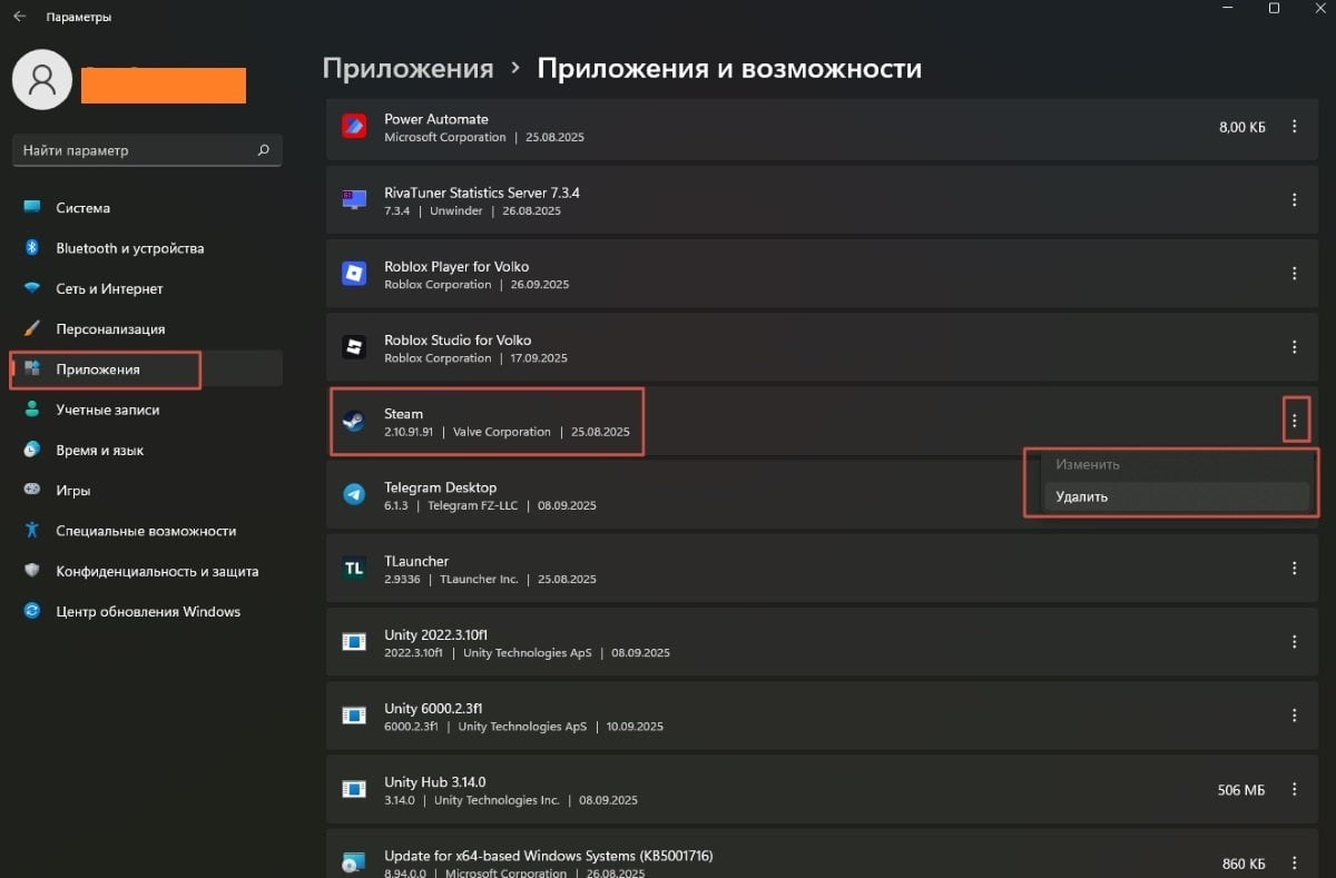Зайдите в «Параметры» и откройте «Программы и компоненты» (Установка и удаление программ). Найдите Steam в списке, выберите его и нажмите «Удалить». После этого найдите папку, где был установлен Steam (например, через расположение файла), и удалите ее.