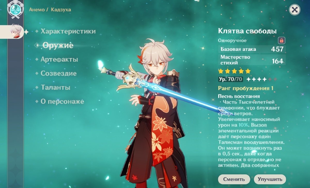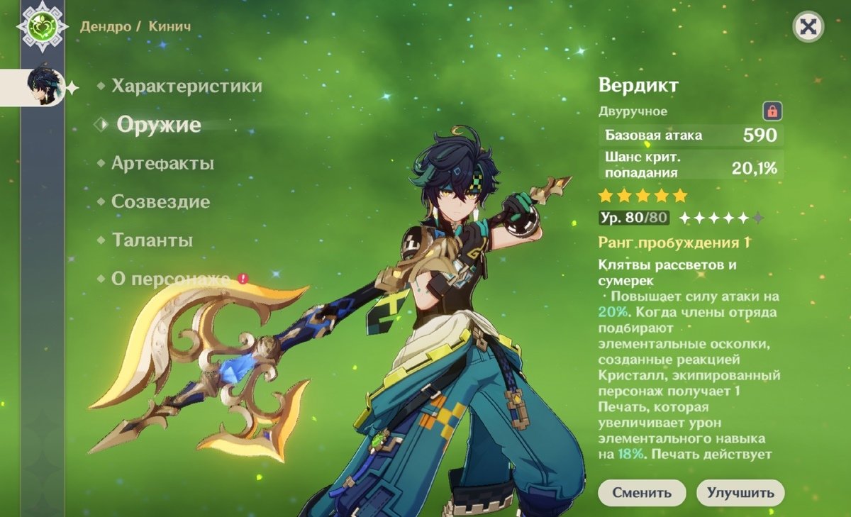 Ползучая зелень (два Дендро элемента). Увеличивается мастерство стихий на 50 единиц. Статусы Горение, Стимуляция и Бутонизация увеличивают мастерство стихий всех членов отряда поблизости на 30 единиц на 6 секунд. Статусы Обострение, Разрастание, Вегетация и Цветение увеличивают мастерство стихий всех членов отряда поблизости на 20 единиц на 6 секунд. Длительность каждого из этих эффектов рассчитывается отдельно.