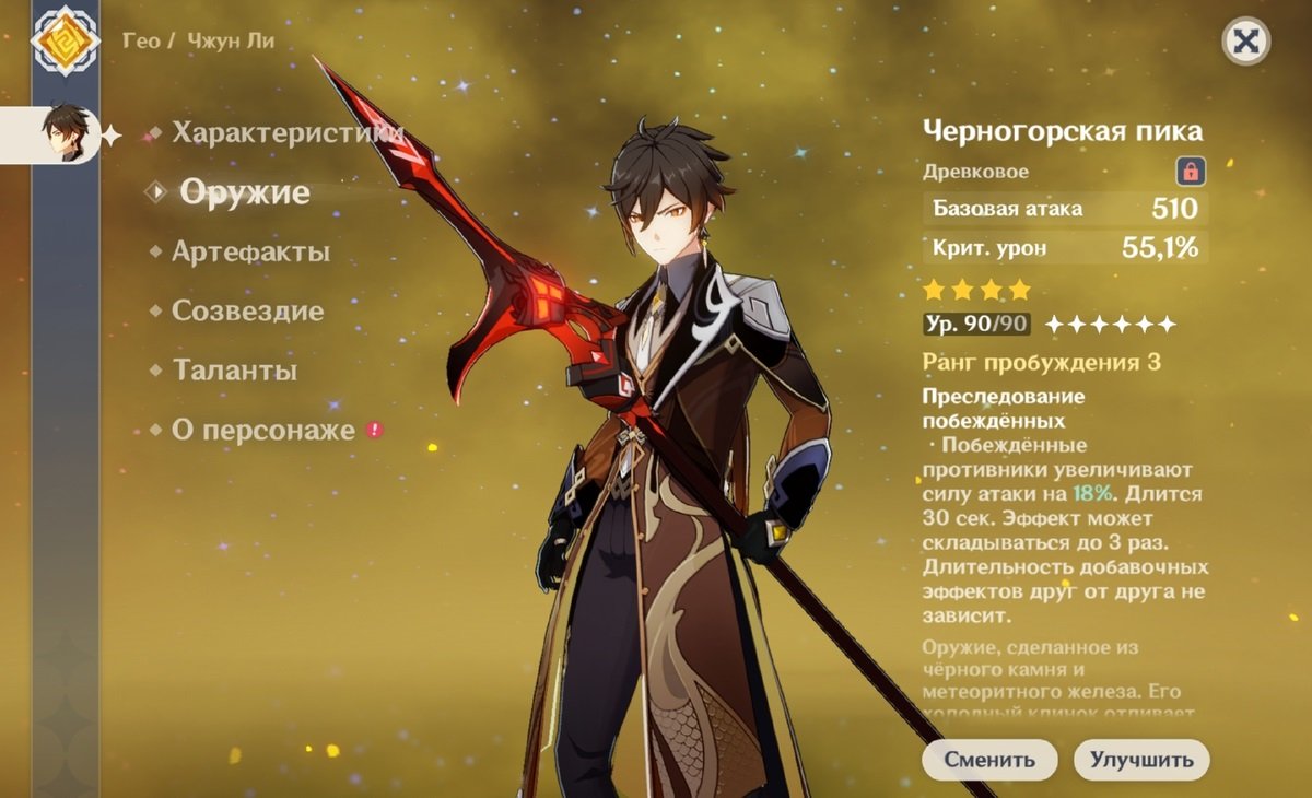 Пылающий огонь (два Пиро элемента). Уменьшается длительность Крио эффекта на 40% и увеличивается силу атаки на 25%.