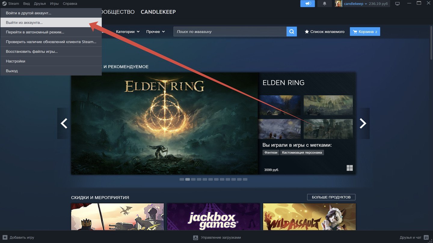 - В левом верхнем углу нажмите «Steam» → «Выйти из аккаунта…»;