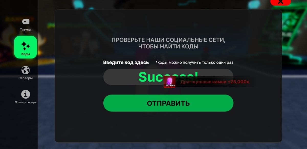 Введите в него рабочий промокод и нажмите кнопку «Отправить». Если код актуален, на экране появится сообщение «Success», а полученная награда всплывет поверх активных окон, подтверждая успешную активацию.