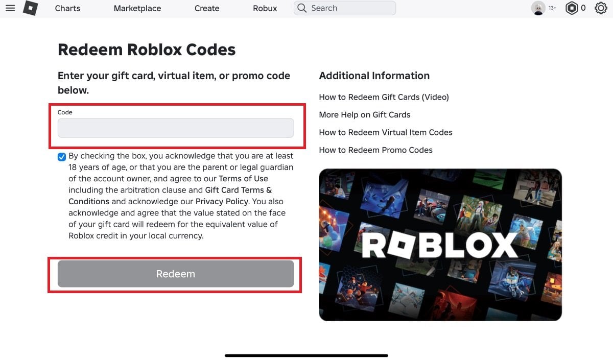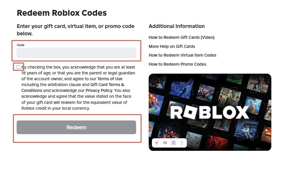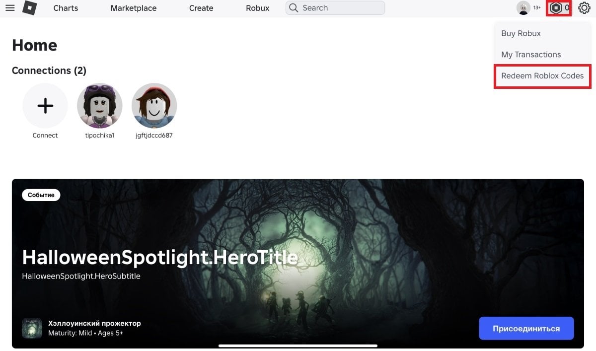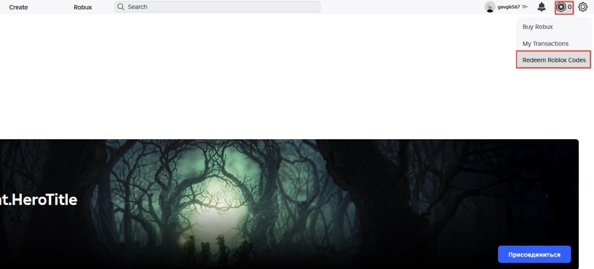 Вводить промокоды на ПК довольно просто. Для этого перейдите на официальную страницу Roblox на своем ПК и войдите в учетную запись. В верхней части экрана найдите иконку монетки, нажмите на нее и выберите «Активируйте коды Roblox» (Redeem Roblox Codes).