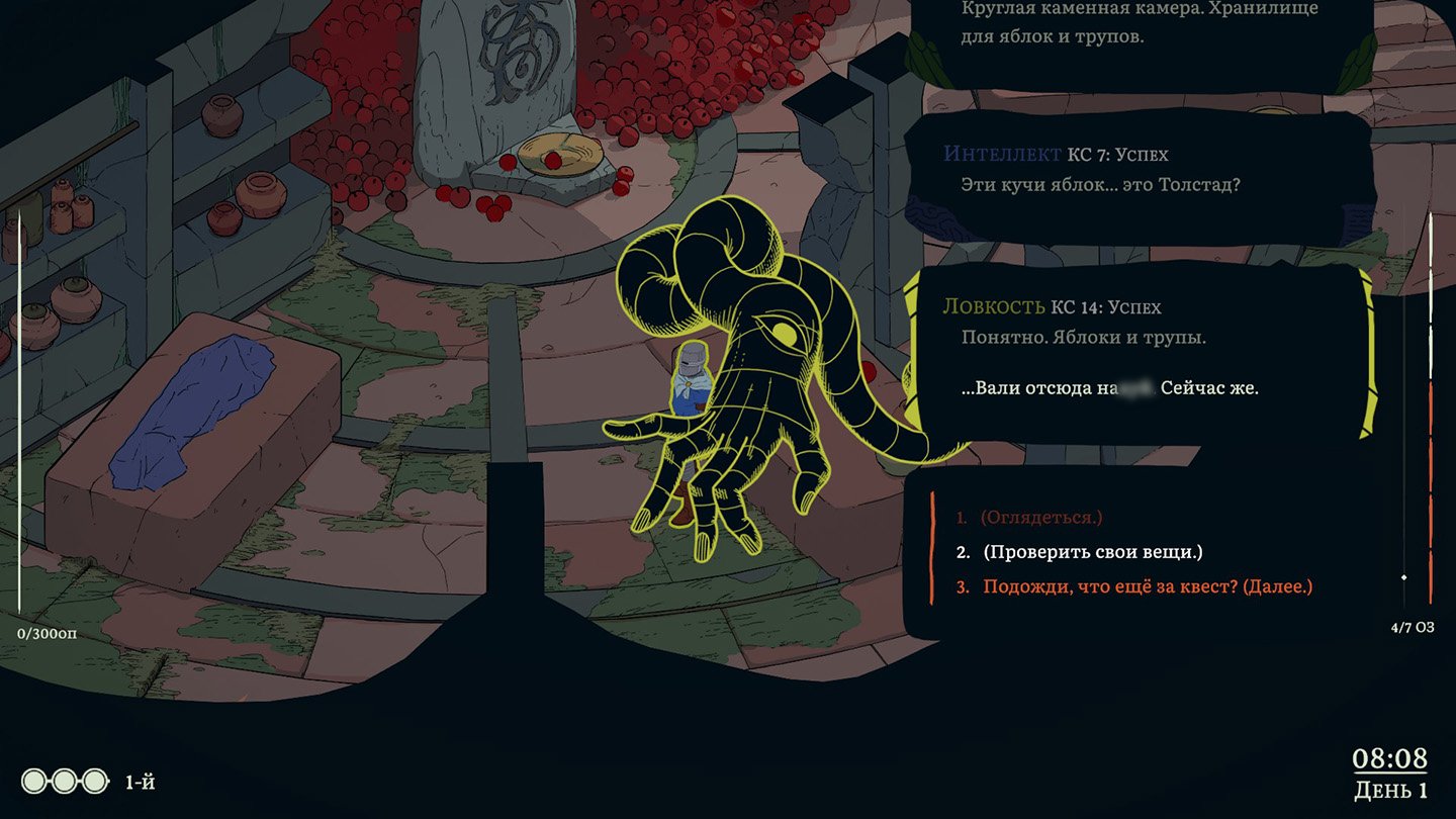 Мы просыпаемся в странном подземелье, где кроме нас есть еще один лежащий под простыней несчастный, бродячий труп, алтарь божества и… яблоки. Горы яблок. С самого начала нас встречает диалог с вашей шизой в виде характеристик, которые в зависимости от прокачки статов могут дать наводку на интересную мысль или воскресить в памяти Клирика интересные детали. Кстати, не забывайте тыкать на оранжевые надписи, это полезно.