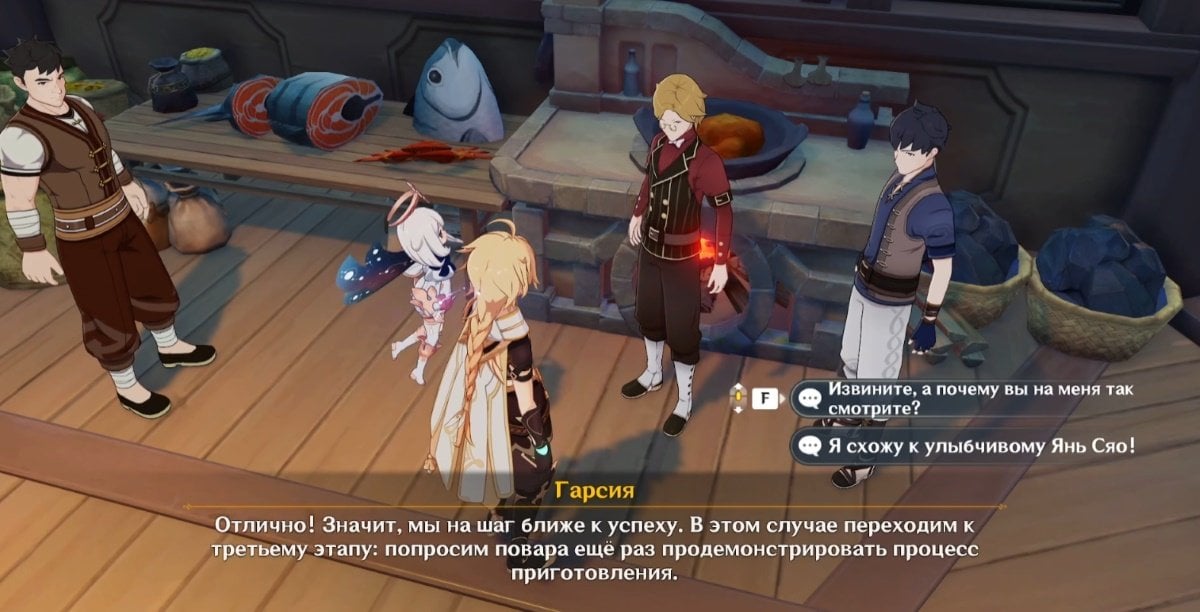 После начала задания вы станете участником обсуждения идеальной формулы овощного супа. Гарсия и его спутник предложат вам попробовать суп, приготовленный по их рецепту, и поделиться впечатлениями. Далее вам нужно отправиться на кухню к Улыбчивому Янь Сяо.