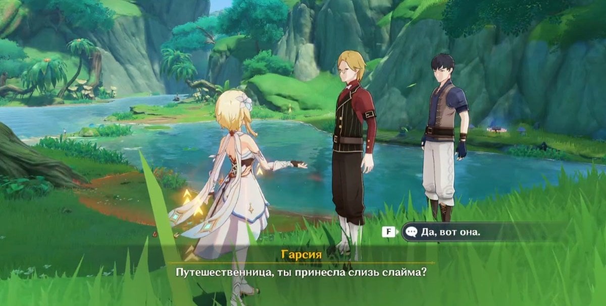 Группа слаймов располагается рядом с местом встречи с Гарсией. Победите всех противников, чтобы собрать материалы. После победы слизь окажется в вашем инвентаре. Затем вернитесь к Гарсии и передайте ему собранную слизь — на этом задание будет завершено.