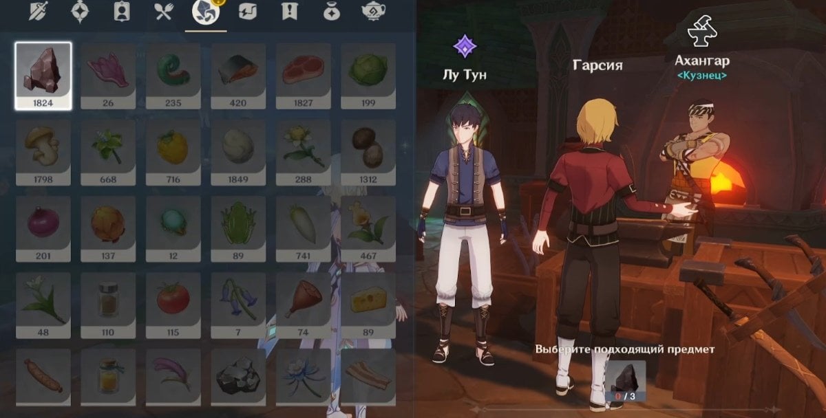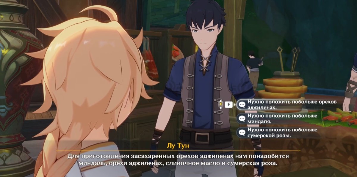 Лу Тун перечислит, какие ингредиенты нужны для приготовления блюда. Можно выбрать любой вариант ответа, это не повлияет на дальнейший ход сюжета. Собирать продукты также не придется.