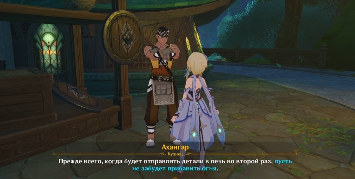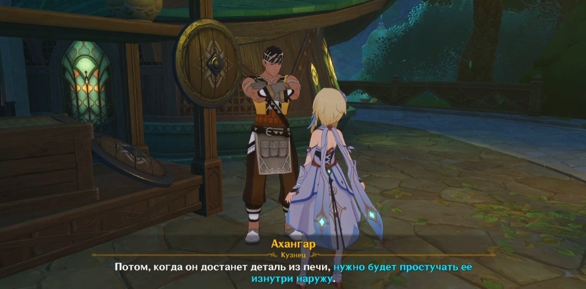 Отправляйтесь к Ахангару и завяжите с ним беседу. Кузнец поделится секретами изготовления шестеренок и даст два важных совета. Во‑первых, при повторной отправке деталей в печь нужно добавить больше огня. Во‑вторых, готовую деталь необходимо простучать изнутри наружу. Внимательно запомните эти рекомендации — они вам понадобятся дальше.