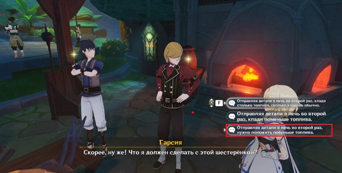 Отправляйтесь к кузнице в Сумеру — там вы найдете Гарсию и Лу Туна, которые ведут оживленный разговор с кузнецом Ахангаром. Из беседы станет ясно: у кузнеца почти не осталось железа, поэтому он не может изготовить подшипники для Числовой машины, а у Гарсии нет средств на закупку материала. Тогда Лу Тун обратится к Путешественнику с просьбой принести три обломка железа.