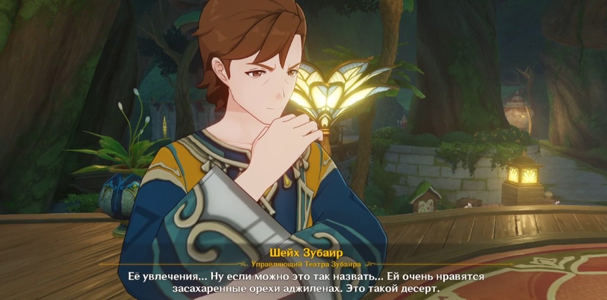 Шейх Зубаир находится на территории Большого базара. От Ахангара поворачивайте направо, ко входу под древо, и спускайтесь, пока не пересечете двери в конце коридора. Попав на Большой базар, поворачивайте налево и поднимайтесь на сцену театра. В ее углу увидите шейха Зубаира. Он подаст идею преподнести девушке ее любимый десерт — засахаренные орехи аджиленах, так как в последнее время она просила его у всех участников труппы.