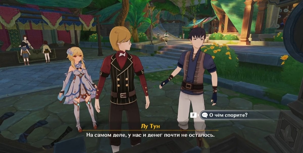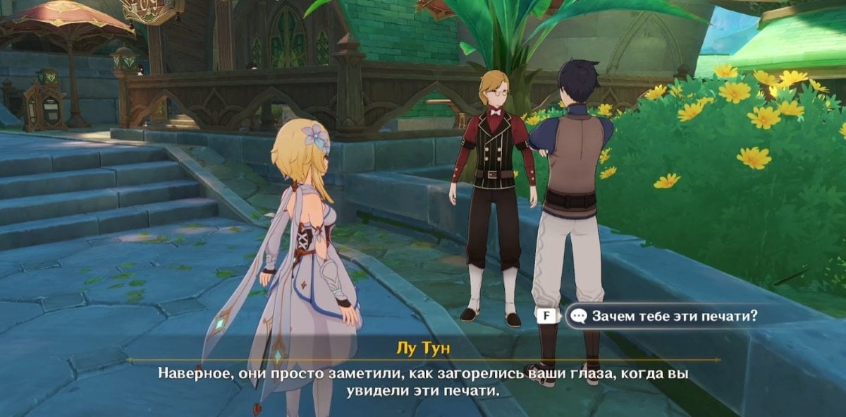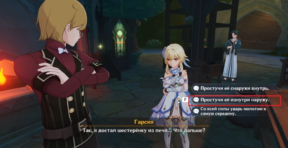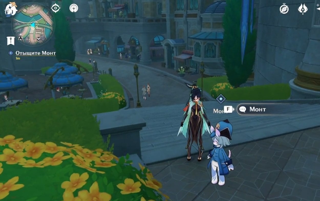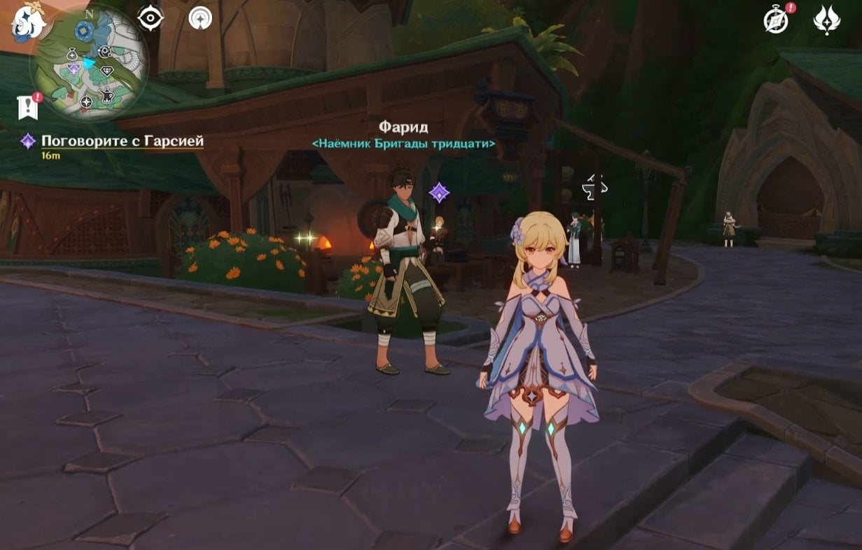 Когда все условия соблюдены, отправляйтесь в Кур‑де‑Фонтейн и идите ко входу на вокзал. Пройдите мимо фонтана, зайдите внутрь здания — слева вы увидите Гарсию и Лу Туна. Далее переместитесь к точке телепортации на северо‑востоке от Фонтана Люсин и двигайтесь в сторону оперного театра «Эпиклез».