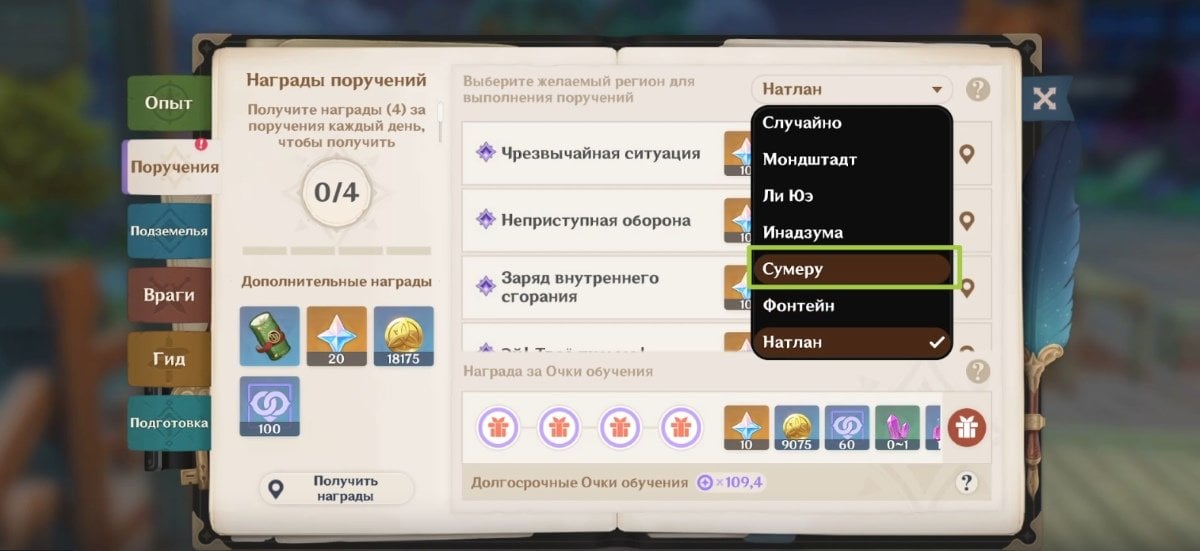 Для увеличения вероятности появления этого задания в журнале квестов, воспользуйтесь справочником искателя приключений. Откройте вкладку «Поручения» и выберите Сумеру в качестве приоритетного региона: тогда все следующие ежедневные задания будут относиться именно к этой локации.