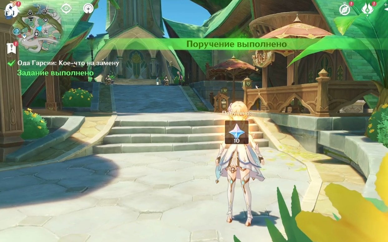 После выполнения этого задания вы сможете перейти к следующему квесту серии — «Ода Гарсии: Великий подшипник». Однако для этого нужно завершить «Кое‑что на замену» 3-4 раза. Если вместо нужного поручения снова появляются «Необходимые вещи», попробуйте временно сменить приоритетный регион для ежедневных заданий, выполнить пару квестов в другой локации, а затем снова установить Сумеру как основной регион — это может помочь получить нужный квест.