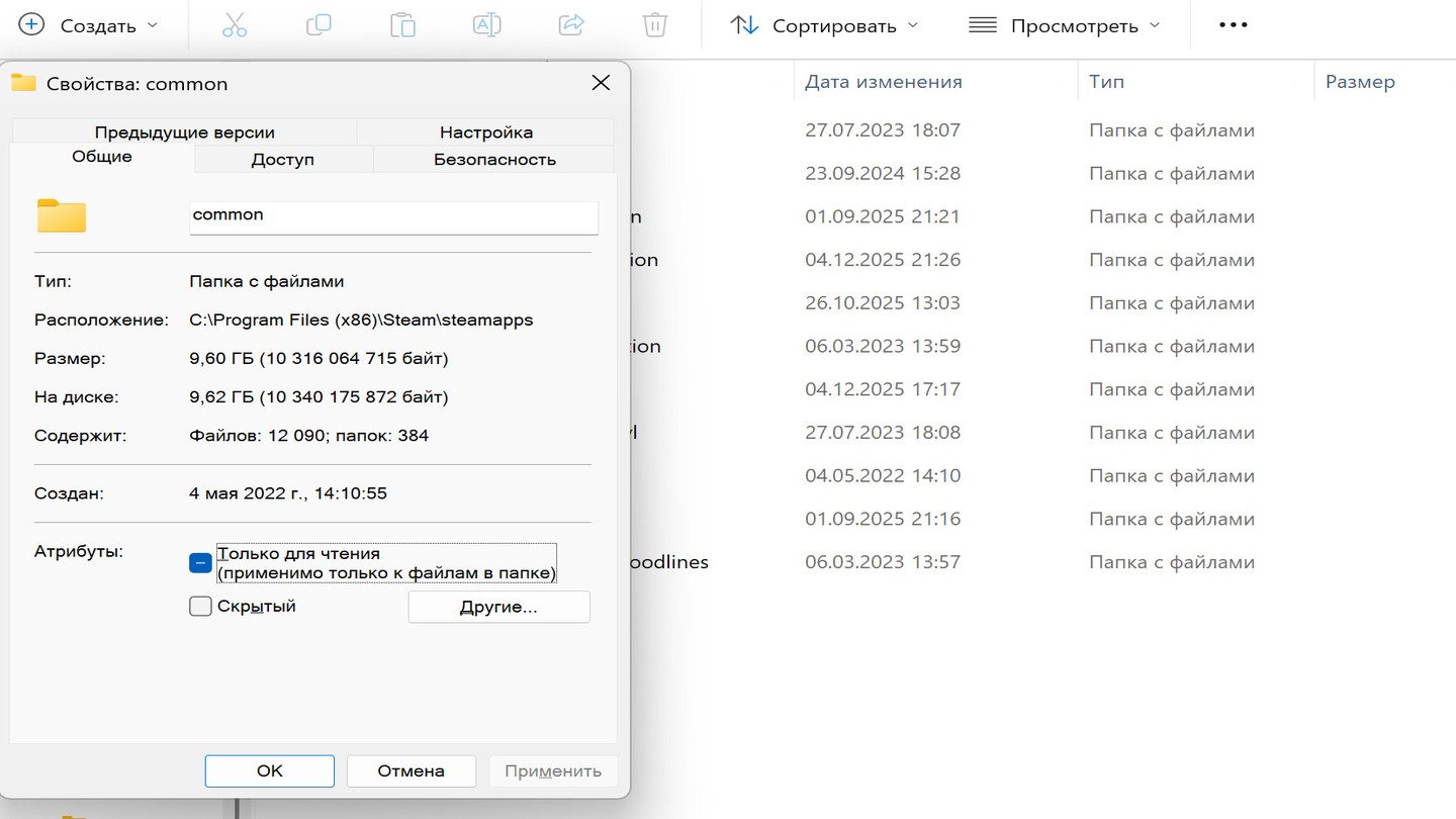 Если корневая папка Steam или каталог steamapps помечены как «только для чтения», клиент не сможет записывать в них данные. Откройте свойства папки Steam, снимите соответствующую галочку и примените изменения ко всем вложенным папкам и файлам.