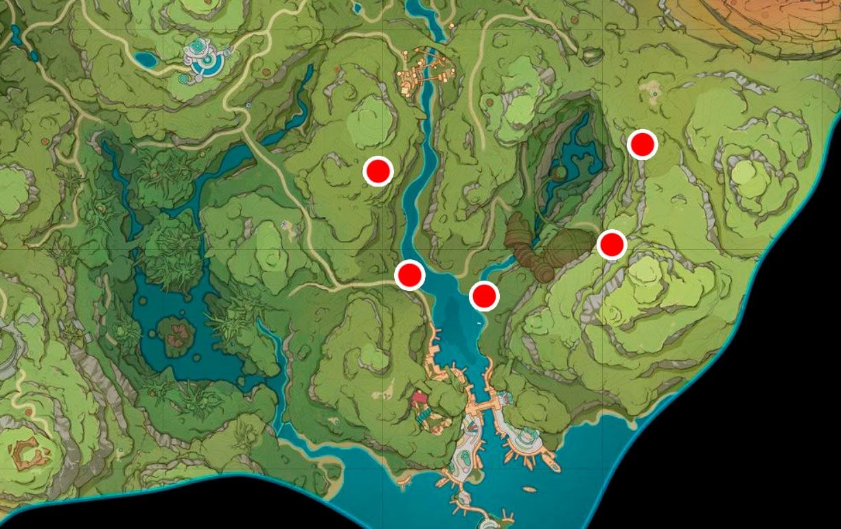 Для начала — посмотрите на карту. На ней мы отметили расположение всех нужных точек. Возле каждого из них вам придется повторить тот трюк с Дендро камнем и дендрогранумом. Без вызова руинного шпиона и сражения с автоматонами этот квест не завершить.