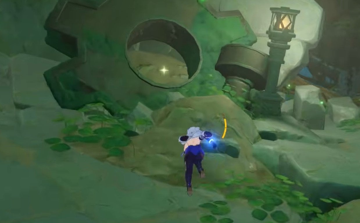 Телепортируемся под землю (если вы открыли этот телепорт, если нет — сначала откройте, там есть ништяки). Нам нужно попасть в пещеру под големом. С помощью быстрого перемещения Сумеру двигаемся сначала на юг, а потом на восток. Планируем ниже к детали, которая находится возле стены пещеры. Куб будет лежать под ней.