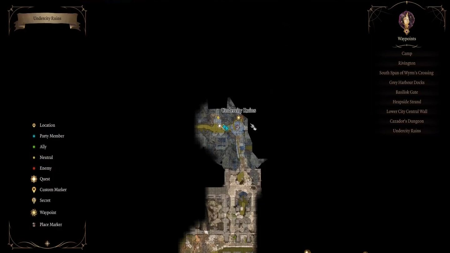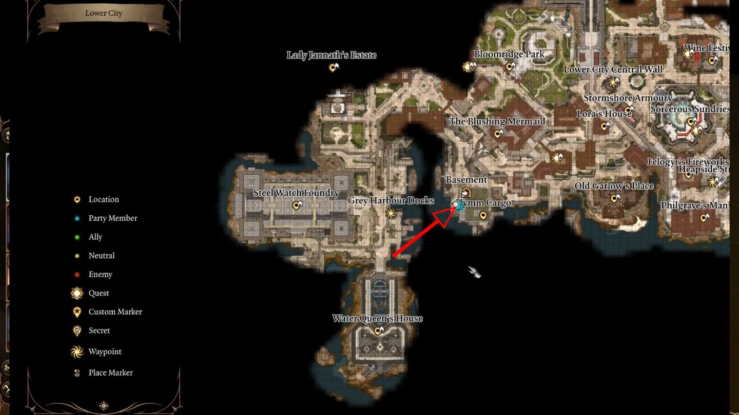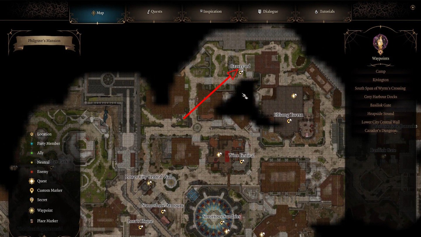 Квест «Найти слугу Мистического падальщика» активируется в третьем акте основной кампании (он связан с квестом «Освободить художника»). Мистический падальщик Baldur's Gate 3 — мощная некромант-мумия, которая скрывается в особняке Филгрейв в Нижнем городе. Особняк расположен у побережья у путевой точки Берег Свалки. На фрагменте карты Нижнего города показана его локация у пирсов и доков, рядом с меткой особняка.