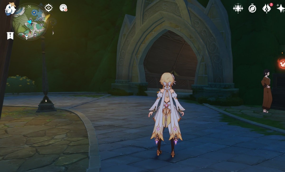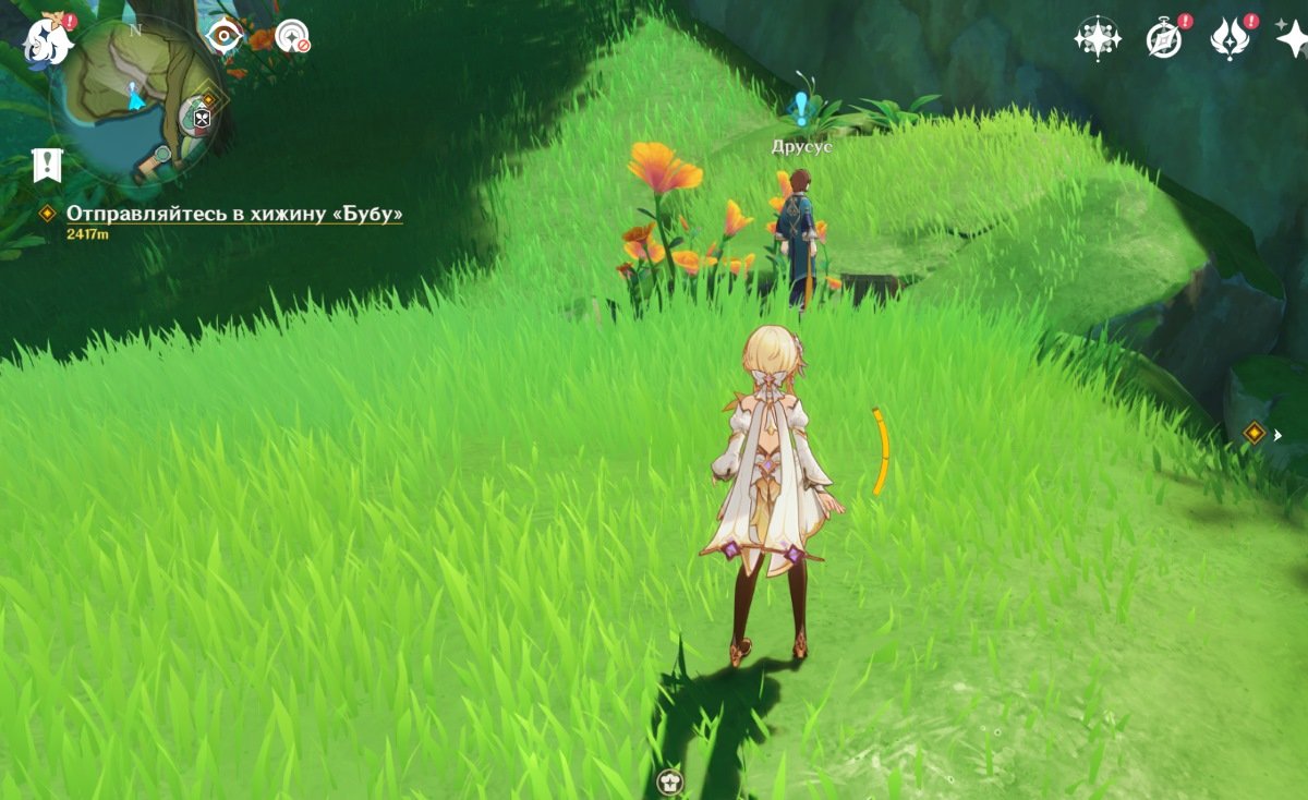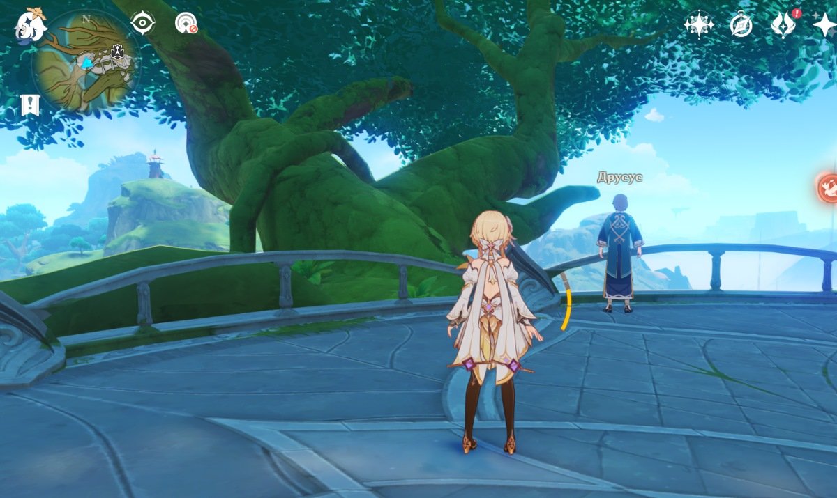 Добегите до места встречи с ученым и поговорите с ним. Если он не появился, вам нужно перемотать время на 12:00, воспользовавшись меню Паймон. После этого вы увидите Друсуса.