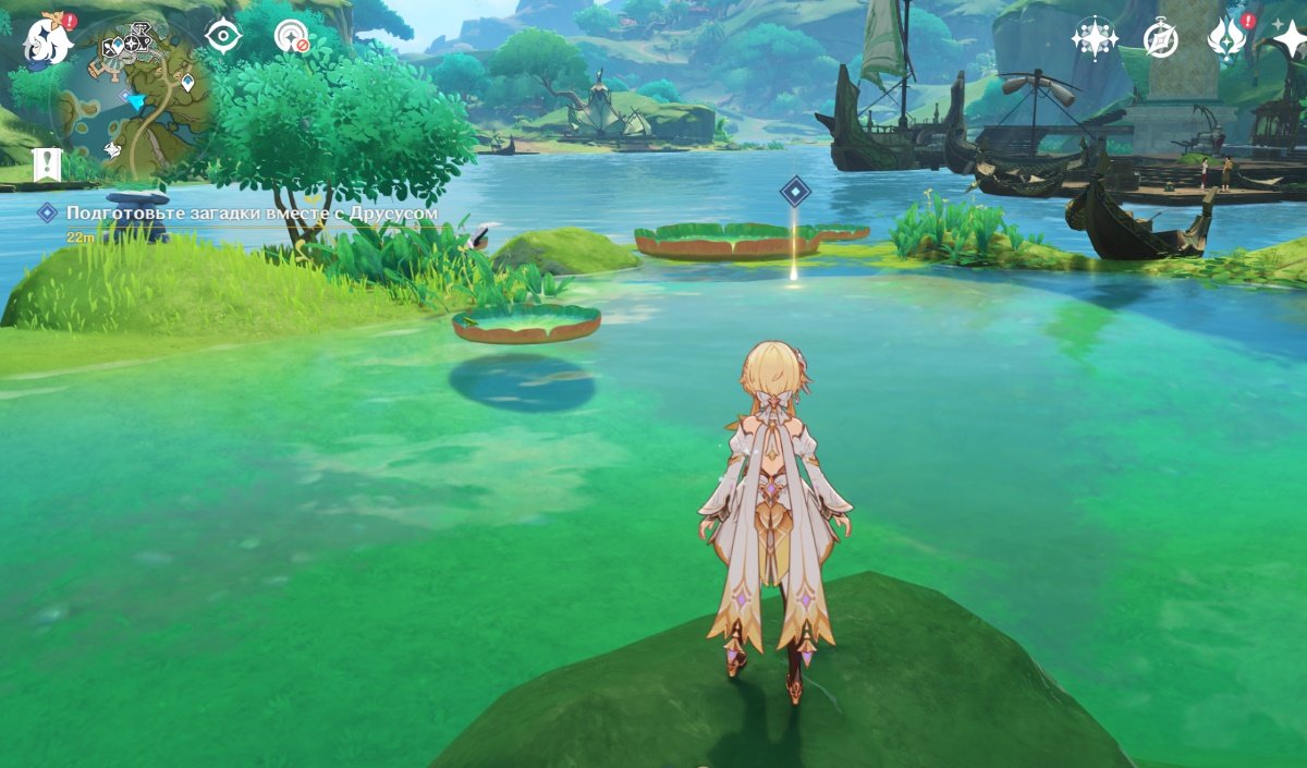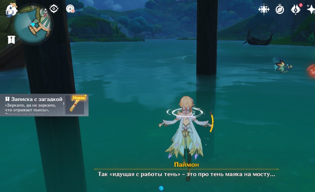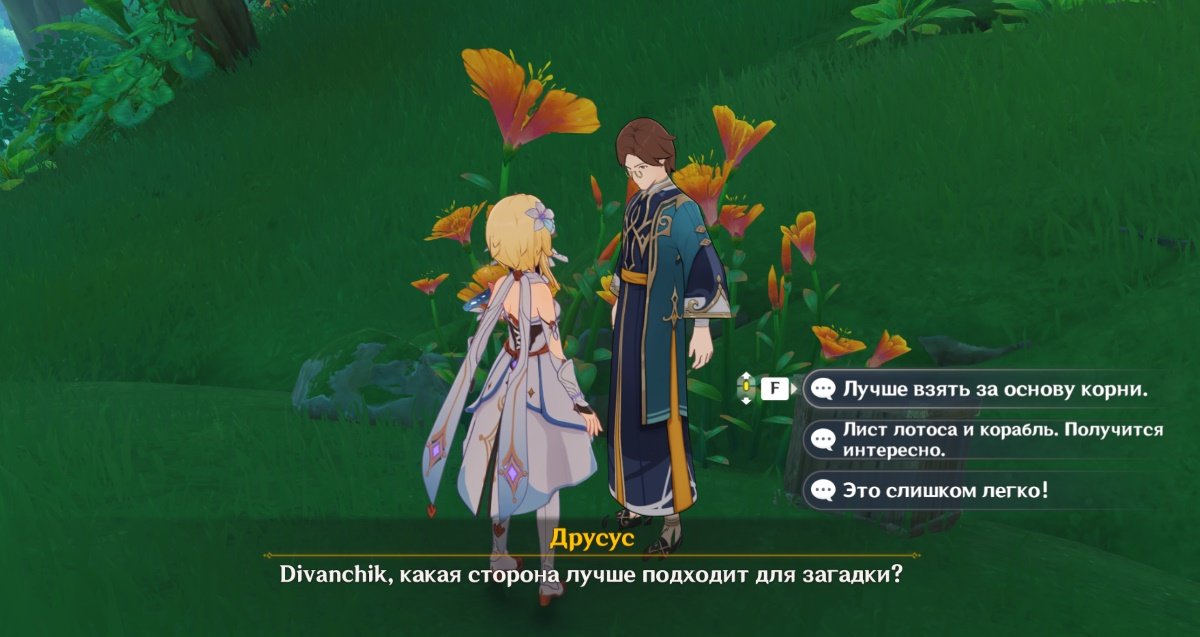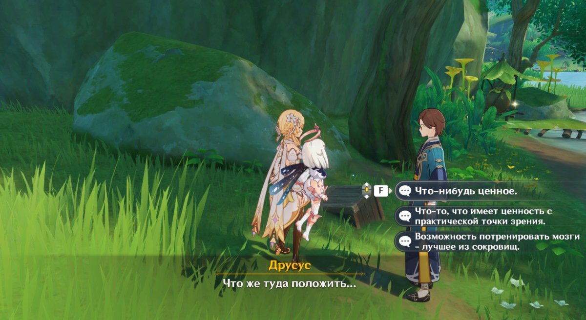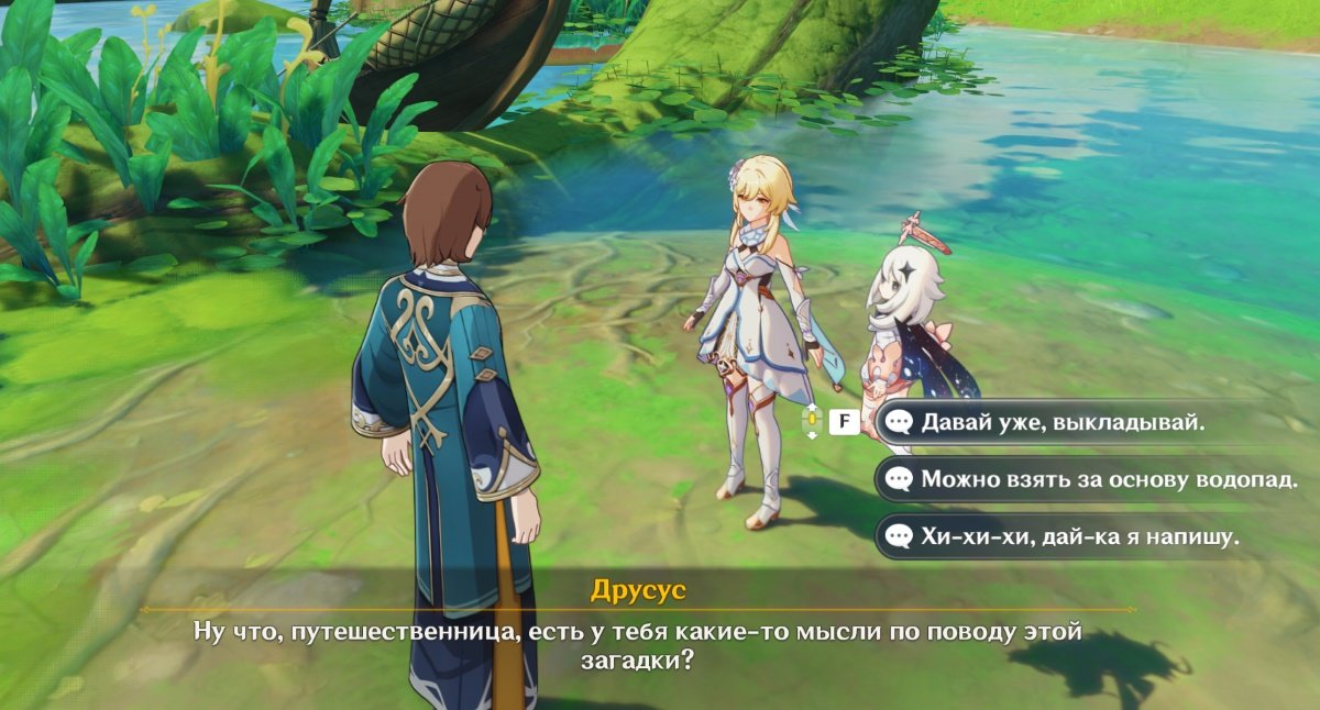 После того, как пройдут реальные сутки, вам станет доступно мировое задание Сокровище мудрости новый план Геншин Импакт. Ученый будет ждать вас недалеко от пристани. Друсус скажет, что работает над совершенно новой серией загадок и спросит, какая сторона гавани лучше подходит для загадки. Выбирайте любой ответ.