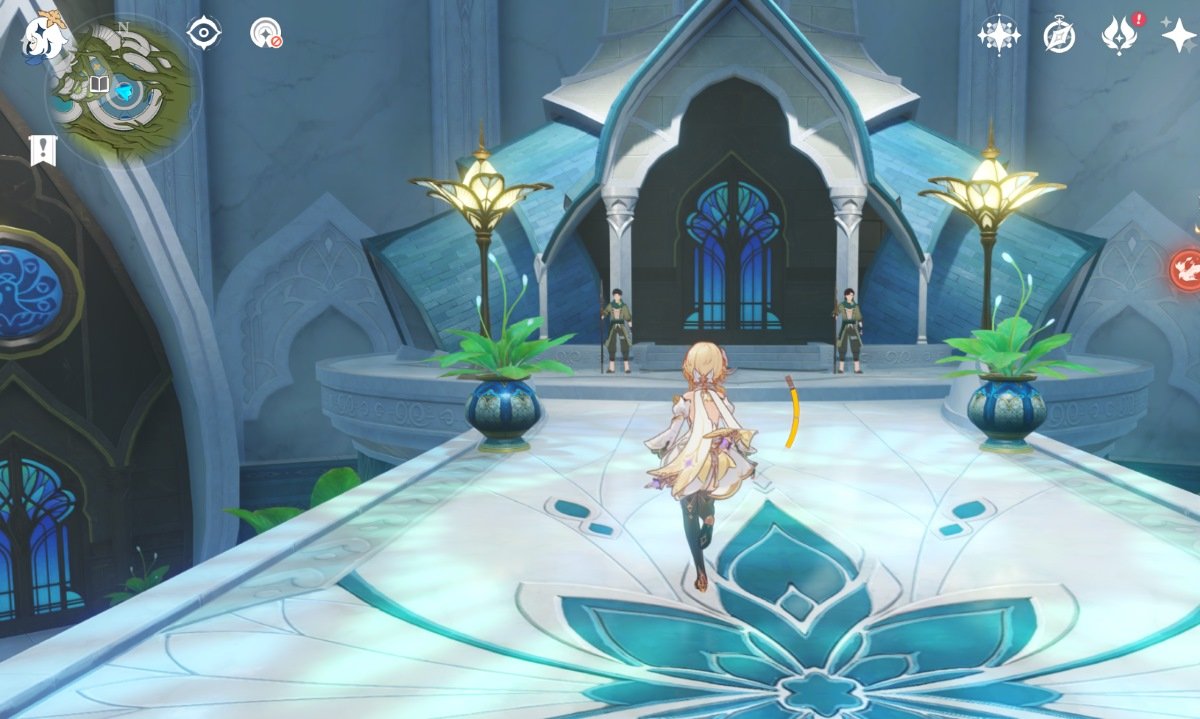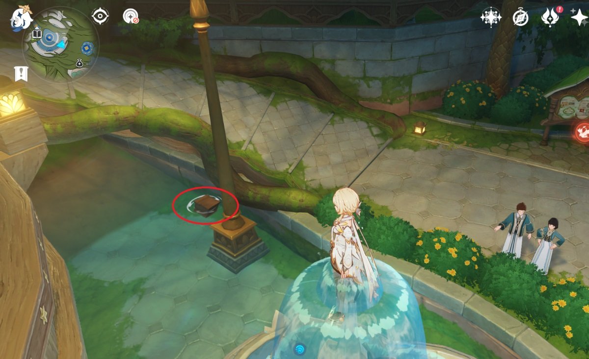 Разгадать ее несложно: первая часть загадки — это вода, а вторая часть — сцена. Вам нужно найти фонтан, расположенный возле сцены, где в одном из заданий выступала Нилу. Найти его можно на Большом базаре. Чтобы туда попасть, пройдите чуть вперед от кузнеца в Сумеру — вход на базар будет прямо там.