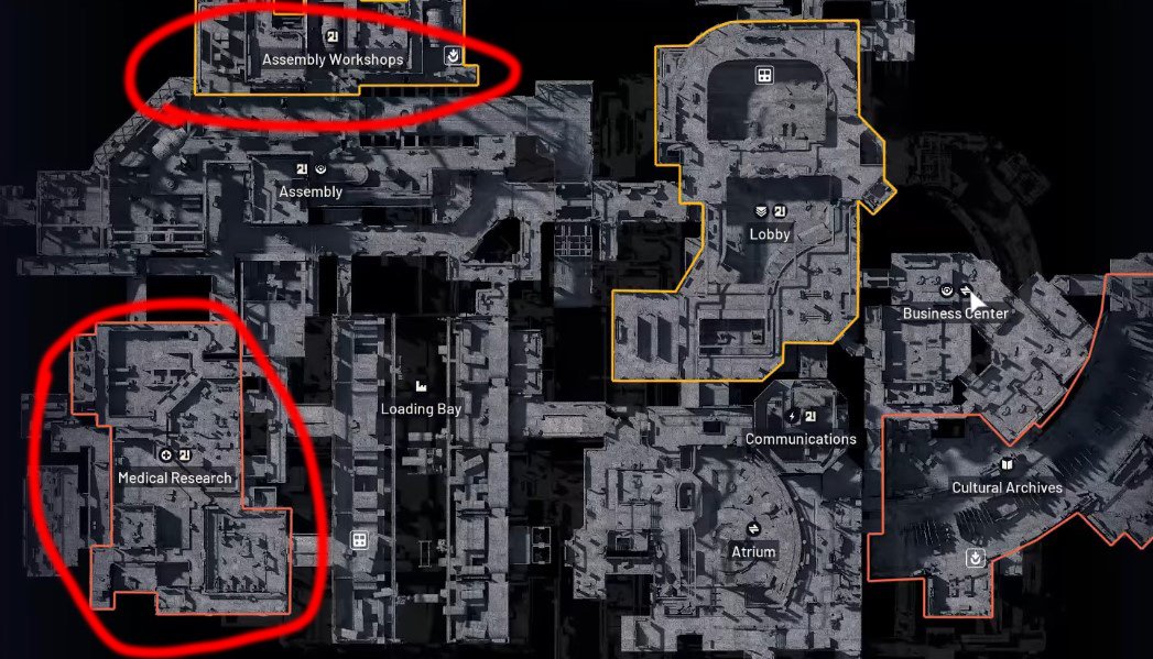 Суть первого задания заключается в том, чтобы найти трех андроидов. Эти давно погибшие обитатели Стеллы Монтис теперь безжизненно валяются на полу в разных частях карты. Можно бегать и искать их по всей локации, но есть способ закрыть квест за один заход. Лучшее место — Сейф семян, которое отмечено на изображении ниже.