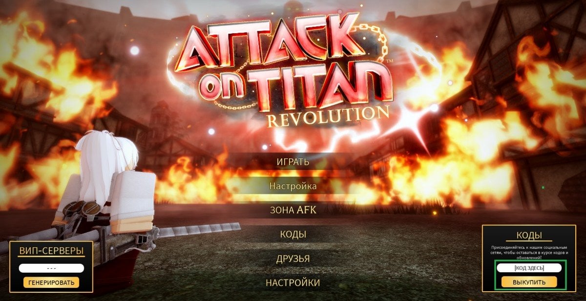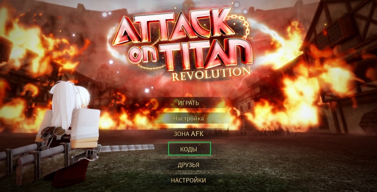 Перед тем, как вводить коды, убедитесь, что ваш уровень не ниже 15-го, иначе они не будут работать. Если вы подходите под условия, запустите плейс «Attack on Titan Revolution» в Роблокс и отыщите раздел «Коды» в меню игры. После этого появится окно, в котором вам нужно ввести промокод. Внимательно введите код, чтобы избежать ошибок. Для активации нажмите на соответствующую кнопку.