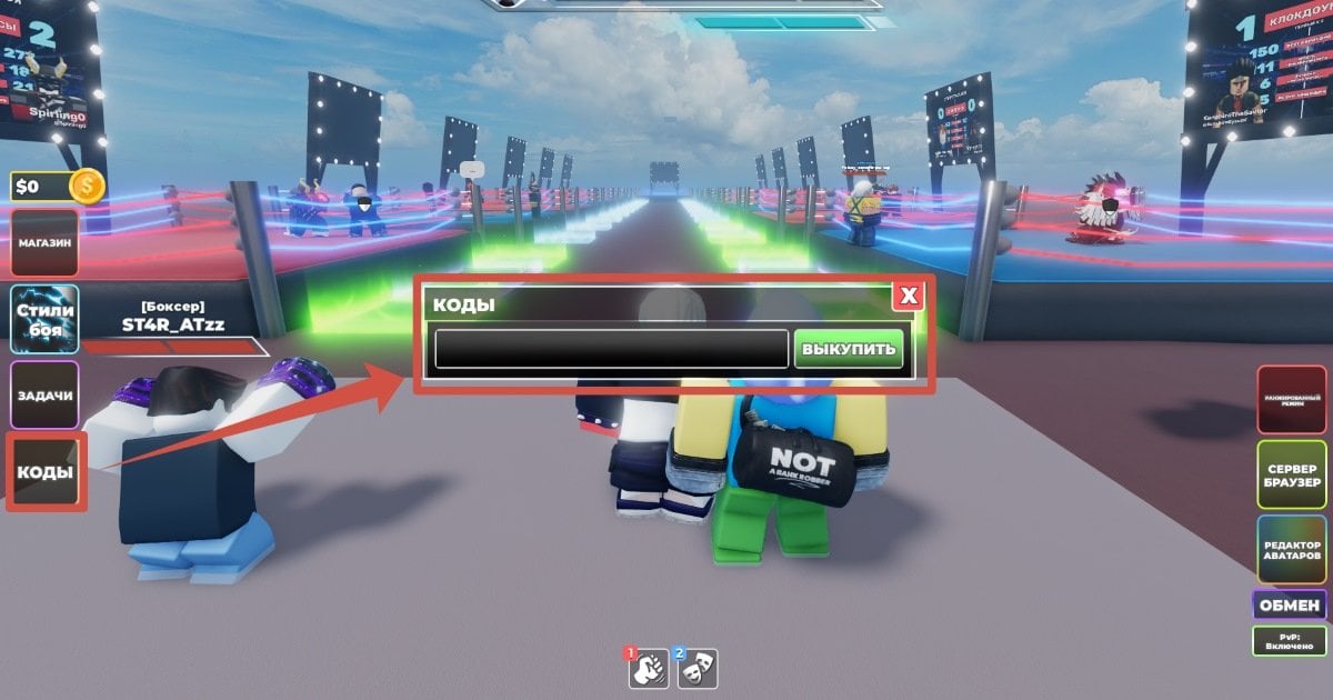 Чтобы активировать промокод в Untitled Boxing Game Roblox (Бокс без названия Роблокс), запустите игру и в лобби выберите вкладку «Коды». В появившемся окне внимательно введите код и подтвердите активацию с помощью кнопки «Выкупить».