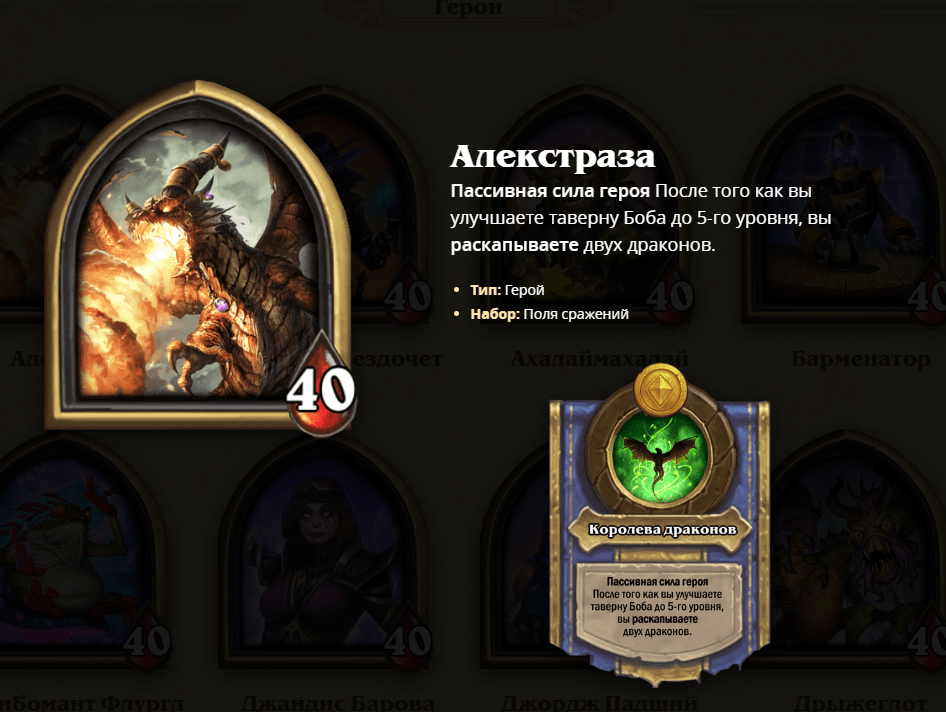 Королева Алекстраза пришла в режим с патчем драконов. И в первое время играть на данном герое было очень тяжело. Все тестили механики новых существ и иногда банально не хватало существ в пуле, чтобы собрать сильную комбу. Однако сейчас Алекстраза достаточно непостоянный герой, ведь её способность даёт возможность при повышении уровня таверны до пяти звёзд нанять двух драконов из разных тиров. Это может быть шестизвёздочный Калесгос, а может и Оголодавший дракон, который никакой роли уже не сыграет. Лично нам очень импонируют драконы, но в виду специфики героя, как бы это не звучало, герой может не взлететь и очень быстро выбыть из партии.