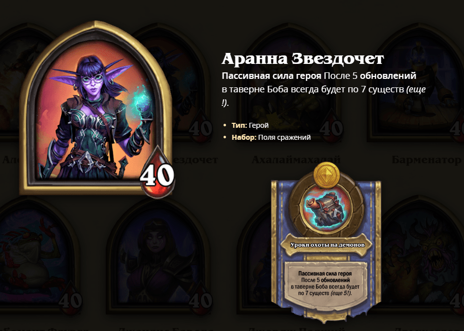 Аранна Звездочёт появилась вместе с выходом дополнения "Руины запределья" и снискала популярность у пользователей. Поскольку иметь возможность выбирать себе из семи существ вместо трёх, четырёх, после пяти (раньше было семь) обновлений таверны (не путать с повышением уровня таверны!) очень кстати. Учитывая что тогда было модно играть через первую таверну и искать Бешеных Завролисков и стражниц с баблами. Но после выхода дополнения с пиратами и фикса завролисков, герой потерял свою актуальность и сейчас практически не играется.
