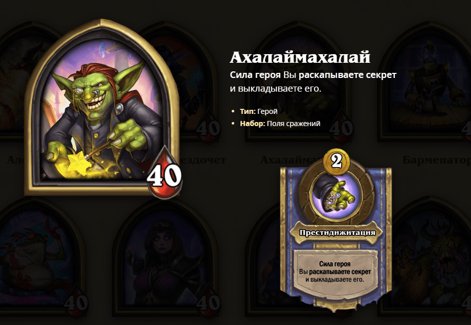 Великий Ахалаймахалай, также как и А.Ф.Ка был одним из первых ввёденных героев на поля сражения. И поначалу его способность раскапывать три из восьми секретов (Ледяная глыба, Расслоение, Защитная матрица, Ядовитая Ловушка, Искупление, Отмщение, Чучело, Змеиная ловушка) была достаточно интересной. Ну кому не хочется получать всего за две золотые монетки айсблок и не переживать, что на следующем ходу вас выкинуть из игры? Тем более, что никто вам не мешает два хода подряд ловить нужны секреты (при толике везения) и занимать первые места! Но в данном патче герой не пользуется особой популярностью